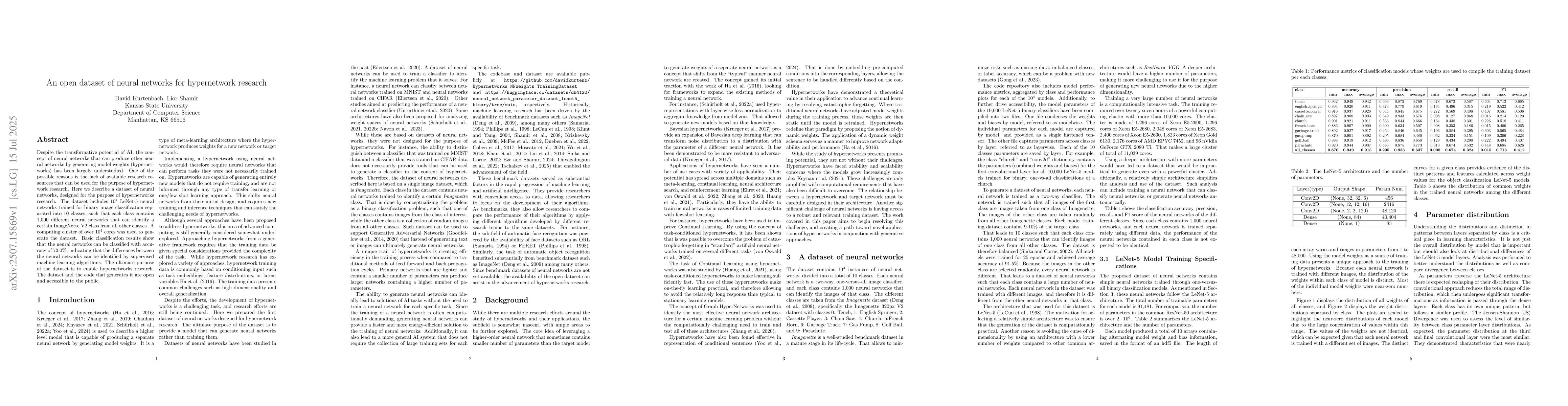 Despite the transformative potential of AI, the concept of neural networks that can produce other neural networks by generating model weights (hypernetworks) has been largely understudied. One of the possible reasons is the lack of available research resources that can be used for the purpose of hypernetwork research. Here we describe a dataset of neural networks, designed for the purpose of hypernetworks research. The dataset includes $10^4$ LeNet-5 neural networks trained for binary image classification separated into 10 classes, such that each class contains 1,000 different neural networks that can identify a certain ImageNette V2 class from all other classes. A computing cluster of over $10^4$ cores was used to generate the dataset. Basic classification results show that the neural networks can be classified with accuracy of 72.0%, indicating that the differences between the neural networks can be identified by supervised machine learning algorithms. The ultimate purpose of the dataset is to enable hypernetworks research. The dataset and the code that generates it are open and accessible to the public.