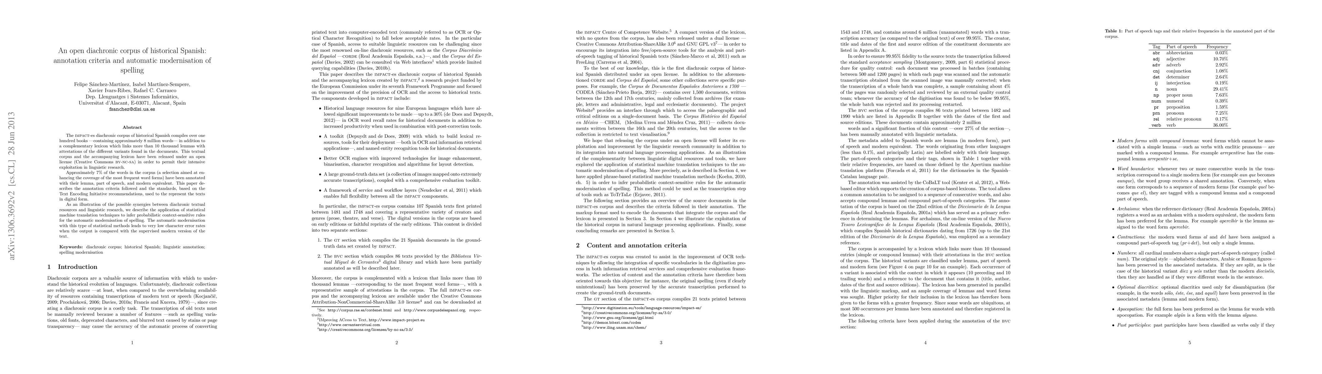 The IMPACT-es diachronic corpus of historical Spanish includes over 100 books and a lexicon linking 10,000 lemmas, released under a Creative Commons license for linguistic research. The paper details annotation criteria and the application of statistical machine translation for automatic spelling modernization, achieving low character error rates.