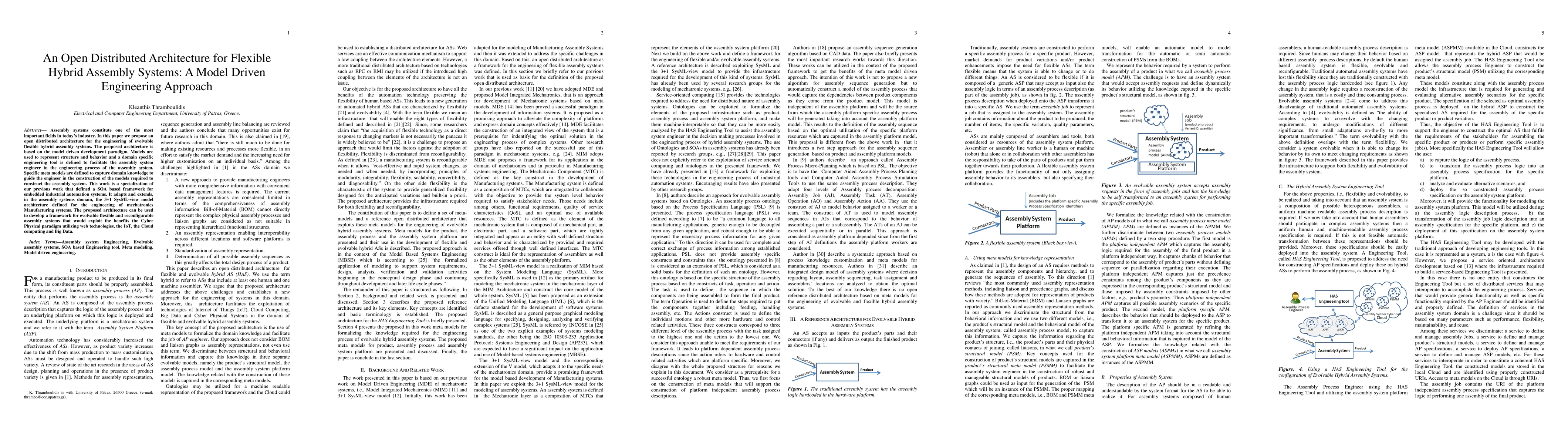 This paper proposes an open distributed architecture for flexible hybrid assembly systems based on model-driven engineering, utilizing SysML-view to capture domain knowledge and facilitate the engineering process. The architecture aims to develop evolvable, reconfigurable systems leveraging web technologies, IoT, cloud computing, and big data.
