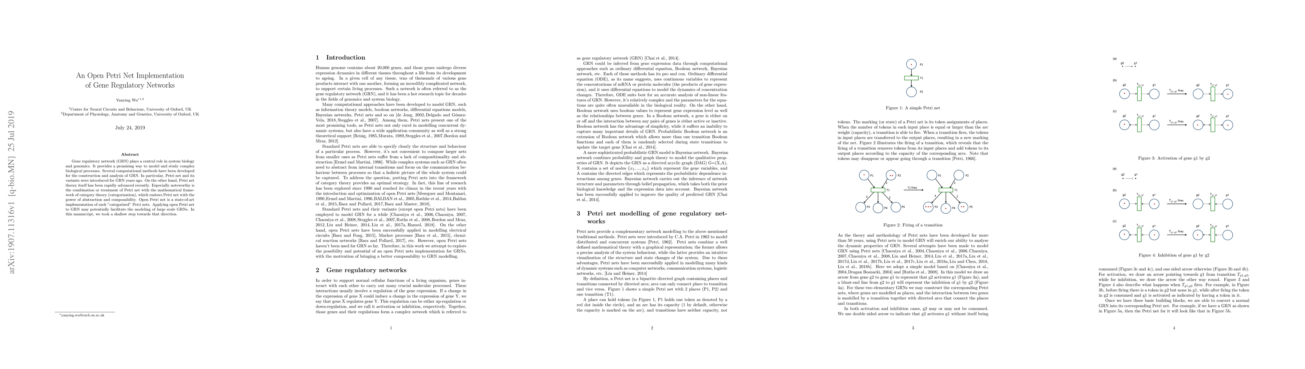 This paper explores the application of open Petri nets, which combine Petri net theory with category theory, to model gene regulatory networks (GRNs). The authors suggest that this advanced implementation could enhance the modeling of large-scale GRNs, offering improved abstraction and composability.