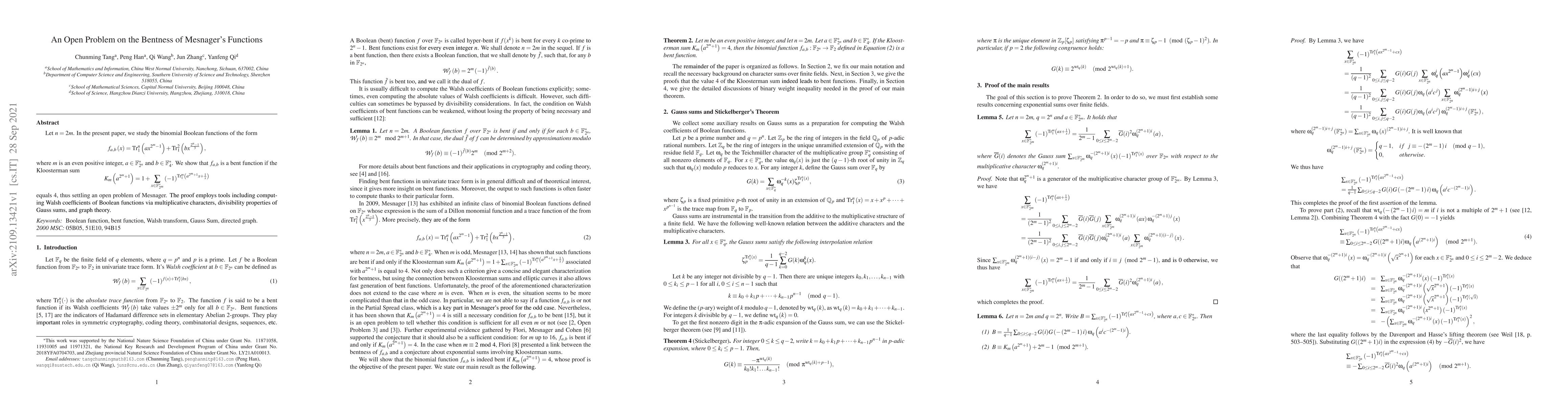 This paper resolves an open problem regarding the bentness of specific binomial Boolean functions of the form $f_{a,b}(x)$, showing that they are bent if a particular Kloosterman sum equals 4. The proof utilizes techniques from computing Walsh coefficients, divisibility properties of Gauss sums, and graph theory.