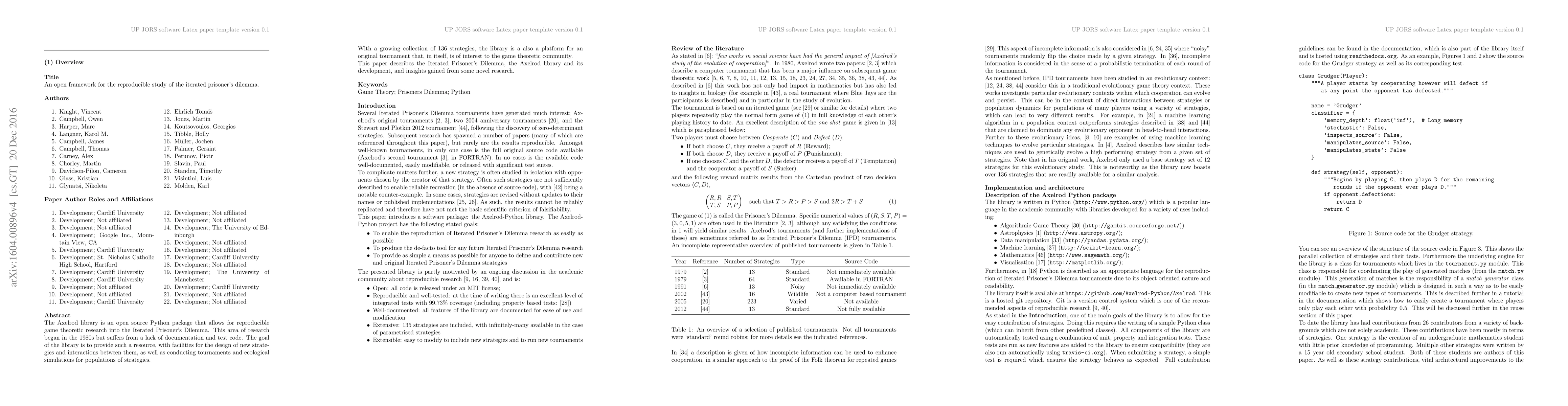 The Axelrod library is an open-source Python package designed to facilitate reproducible research on the Iterated Prisoner's Dilemma, featuring tools for strategy design, tournament simulations, and ecological interactions. It includes a collection of 139 strategies and offers insights from a new tournament conducted within the framework.