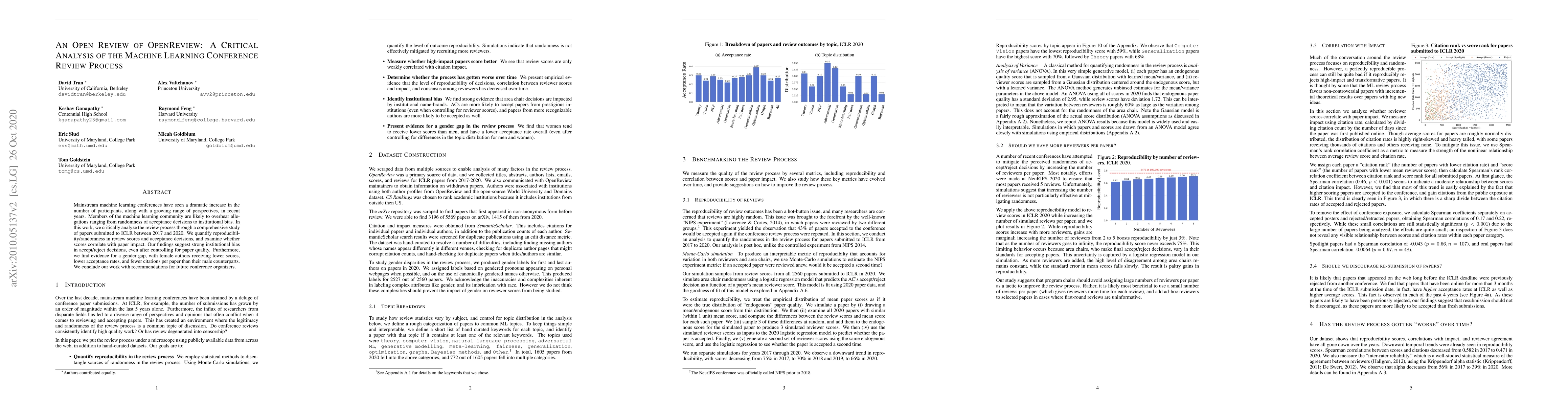 Mainstream machine learning conferences have seen a dramatic increase in the number of participants, along with a growing range of perspectives, in recent years. Members of the machine learning community are likely to overhear allegations ranging from randomness of acceptance decisions to institutional bias. In this work, we critically analyze the review process through a comprehensive study of papers submitted to ICLR between 2017 and 2020. We quantify reproducibility/randomness in review scores and acceptance decisions, and examine whether scores correlate with paper impact. Our findings suggest strong institutional bias in accept/reject decisions, even after controlling for paper quality. Furthermore, we find evidence for a gender gap, with female authors receiving lower scores, lower acceptance rates, and fewer citations per paper than their male counterparts. We conclude our work with recommendations for future conference organizers.