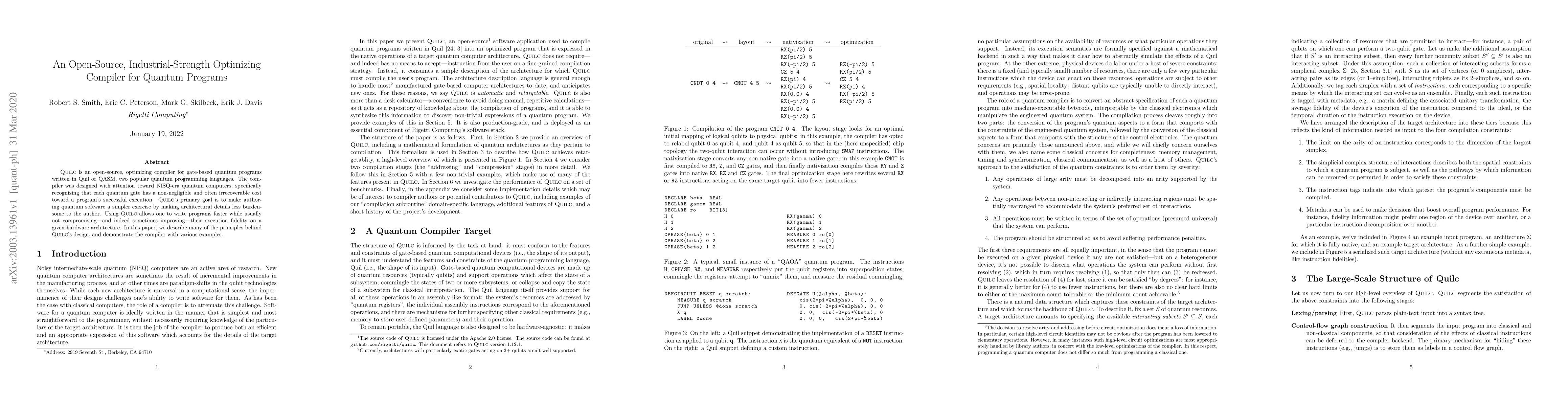 Quilc is an open-source, optimizing compiler for gate-based quantum programs written in Quil or QASM, two popular quantum programming languages. The compiler was designed with attention toward NISQ-era quantum computers, specifically recognizing that each quantum gate has a non-negligible and often irrecoverable cost toward a program's successful execution. Quilc's primary goal is to make authoring quantum software a simpler exercise by making architectural details less burdensome to the author. Using Quilc allows one to write programs faster while usually not compromising---and indeed sometimes improving---their execution fidelity on a given hardware architecture. In this paper, we describe many of the principles behind Quilc's design, and demonstrate the compiler with various examples.