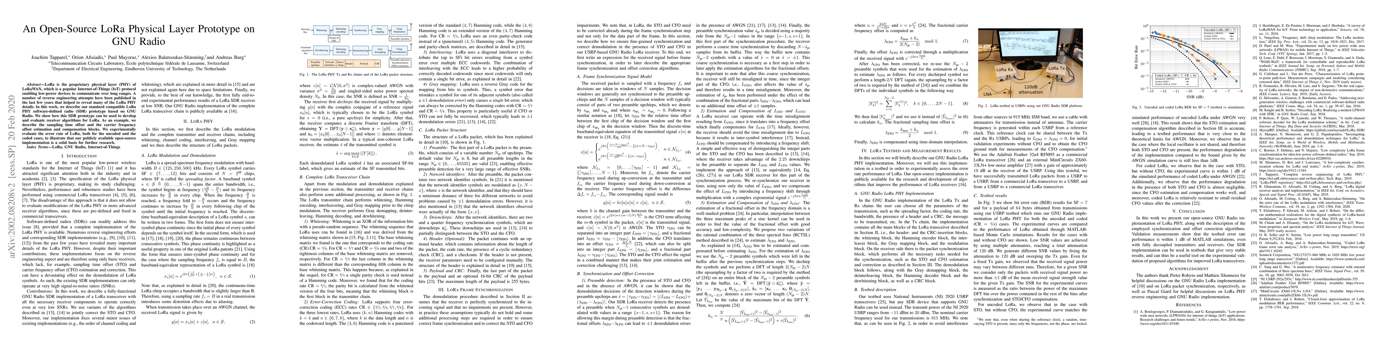 This paper presents an open-source LoRa physical layer prototype based on GNU Radio, detailing its use for developing and evaluating receiver algorithms, including sampling time and carrier frequency offset estimation. Experimental results show that the implementation effectively reduces error rates for both uncoded and coded LoRa transmissions.
