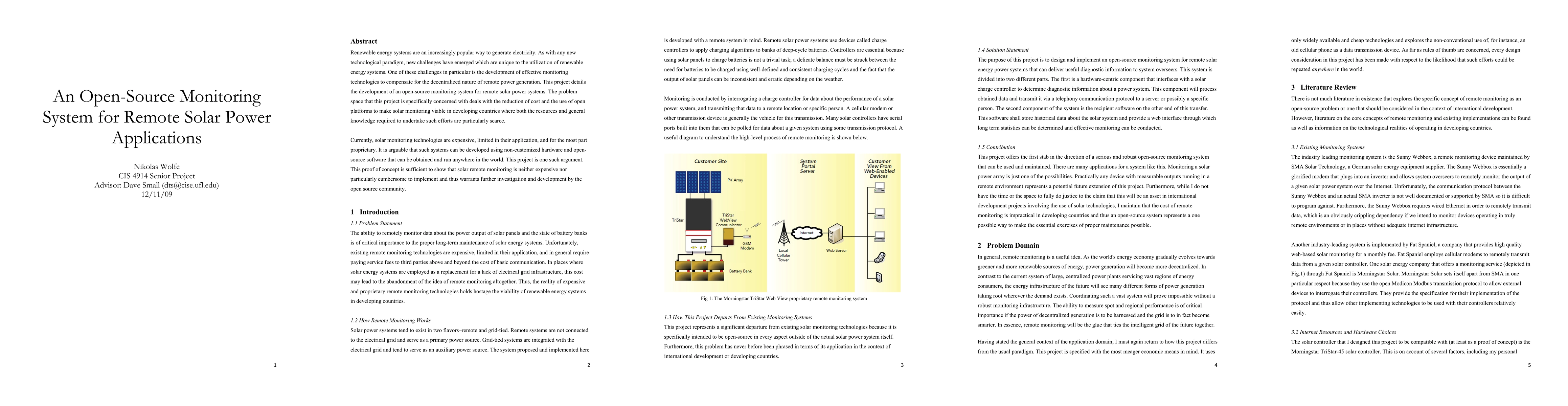 Renewable energy systems are an increasingly popular way to generate electricity. As with any new technological paradigm, new challenges have emerged which are unique to the utilization of renewable energy systems. One of these challenges in particular is the development of effective monitoring technologies to compensate for the decentralized nature of remote power generation. This project details the development of an open-source monitoring system for remote solar power systems. The problem space that this project is specifically concerned with deals with the reduction of cost and the use of open platforms to make solar monitoring viable in developing countries where both the resources and general knowledge required to undertake such efforts are particularly scarce. Currently, solar monitoring technologies are expensive, limited in their application, and for the most part proprietary. It is arguable that such systems can be developed using non-customized hardware and open-source software that can be obtained and run anywhere in the world. This project is one such argument. This proof of concept is sufficient to show that solar remote monitoring is neither expensive nor particularly cumbersome to implement and thus warrants further investigation and development by the open source community.