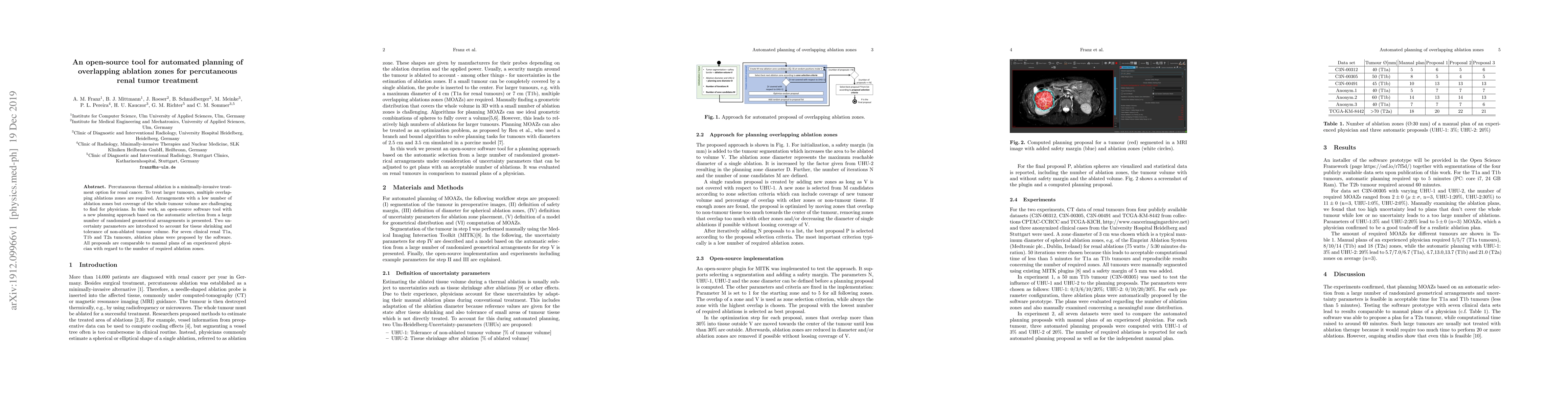 This paper introduces an open-source tool for automated planning of overlapping ablation zones for percutaneous renal tumor treatment, employing a novel approach to automatically select optimal arrangements from randomized geometrical configurations. The tool accounts for tissue shrinkage and non-ablated tumor volume, generating ablation plans comparable to those manually designed by experienced physicians.