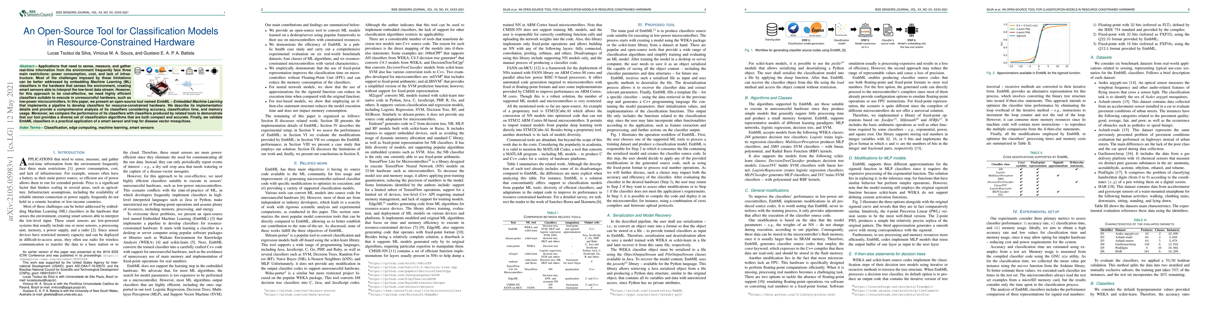 Applications that need to sense, measure, and gather real-time information from the environment frequently face three main restrictions: power consumption, cost, and lack of infrastructure. Most of the challenges imposed by these limitations can be better addressed by embedding Machine Learning (ML) classifiers in the hardware that senses the environment, creating smart sensors able to interpret the low-level data stream. However, for this approach to be cost-effective, we need highly efficient classifiers suitable to execute in unresourceful hardware, such as low-power microcontrollers. In this paper, we present an open-source tool named EmbML - Embedded Machine Learning that implements a pipeline to develop classifiers for resource-constrained hardware. We describe its implementation details and provide a comprehensive analysis of its classifiers considering accuracy, classification time, and memory usage. Moreover, we compare the performance of its classifiers with classifiers produced by related tools to demonstrate that our tool provides a diverse set of classification algorithms that are both compact and accurate. Finally, we validate EmbML classifiers in a practical application of a smart sensor and trap for disease vector mosquitoes.