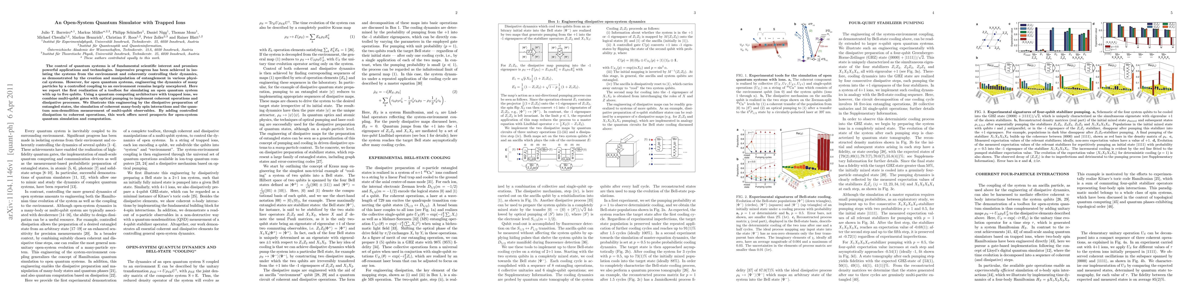 This paper introduces an open-system quantum simulator using trapped ions to simulate dynamics of quantum systems with environmental coupling. It demonstrates techniques for multi-qubit gates, optical pumping, and controlled dissipation to prepare entangled states and simulate spin interactions, offering new avenues for quantum computation in open systems.