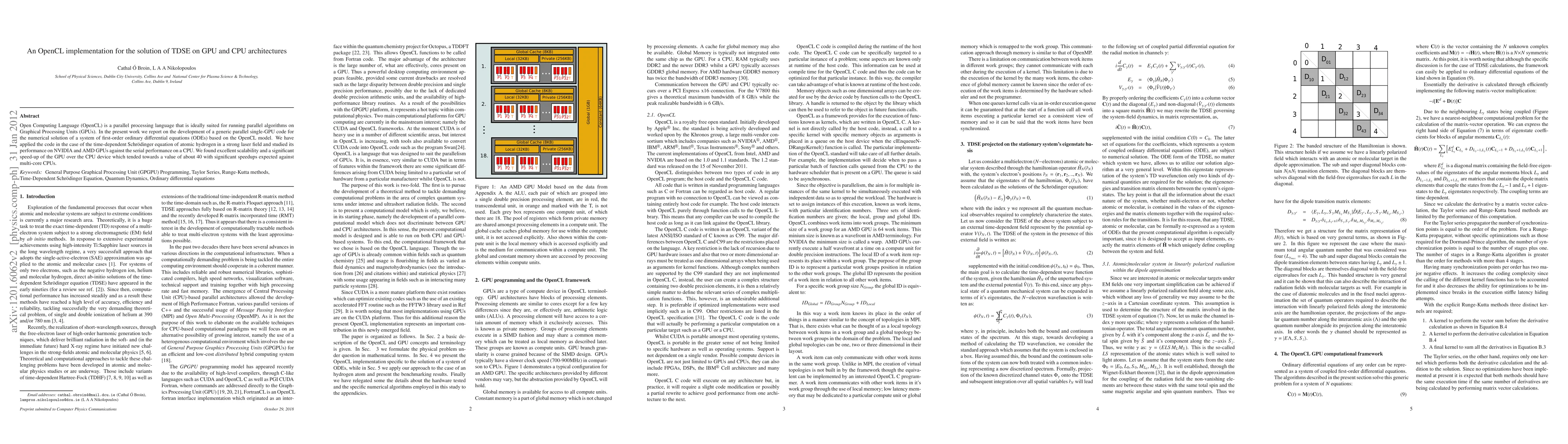 This paper presents an OpenCL implementation for solving the Time-Dependent Schrödinger Equation on GPUs and CPUs, demonstrating excellent scalability and a speed-up of approximately 40 times compared to CPU performance, with significant potential for further optimization on multi-core CPUs.