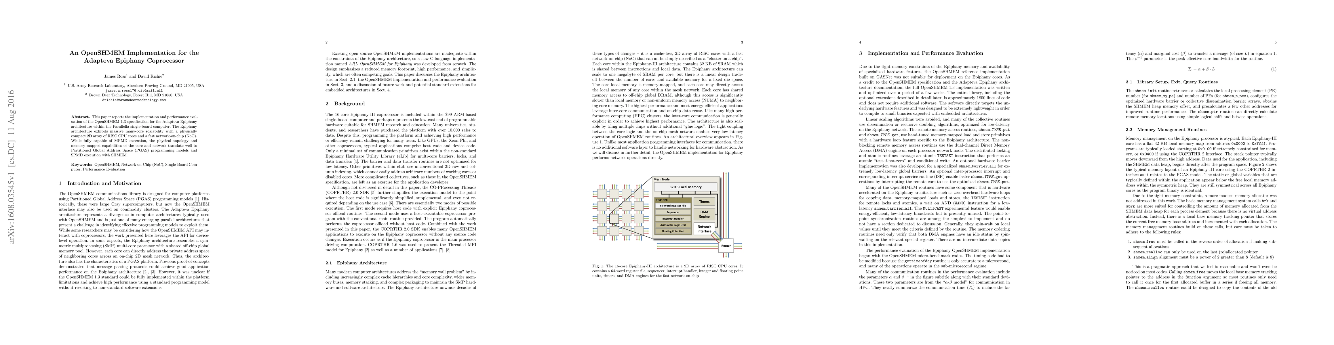 This paper details an implementation of OpenSHMEM 1.3 for the Adapteva Epiphany coprocessor on the Parallella board, showcasing its scalability and performance in a many-core environment with a network-on-chip, suitable for PGAS programming models. Performance evaluations highlight the benefits of the Epiphany architecture in executing SPMD tasks with SHMEM.