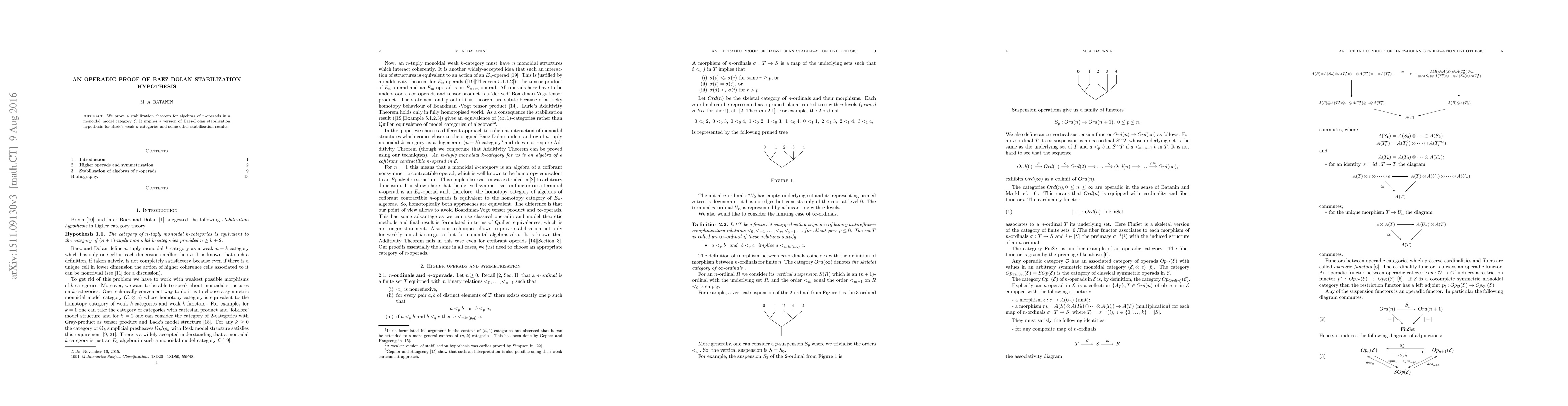 This paper provides an operadic proof of the Baez-Dolan stabilization hypothesis by establishing a stabilization theorem for n-operad algebras in monoidal model categories, which also supports Rezk's weak n-categories and other related stabilization results.
