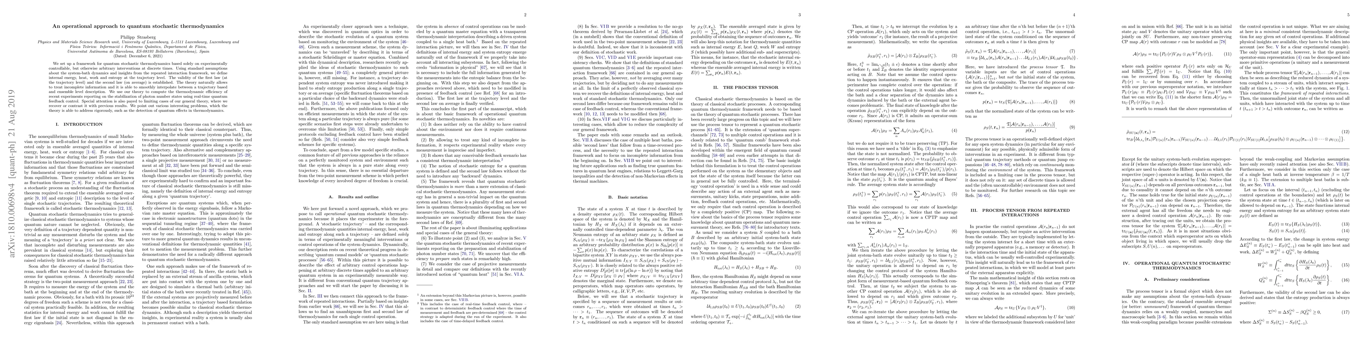 This paper establishes a quantum stochastic thermodynamics framework based on discrete interventions. It defines internal energy, heat, work, and entropy at the trajectory level, confirming the first and second laws of thermodynamics. The theory also addresses incomplete information and interpolates between trajectory and ensemble descriptions, applied to compute the efficiency of photon number state stabilization experiments.