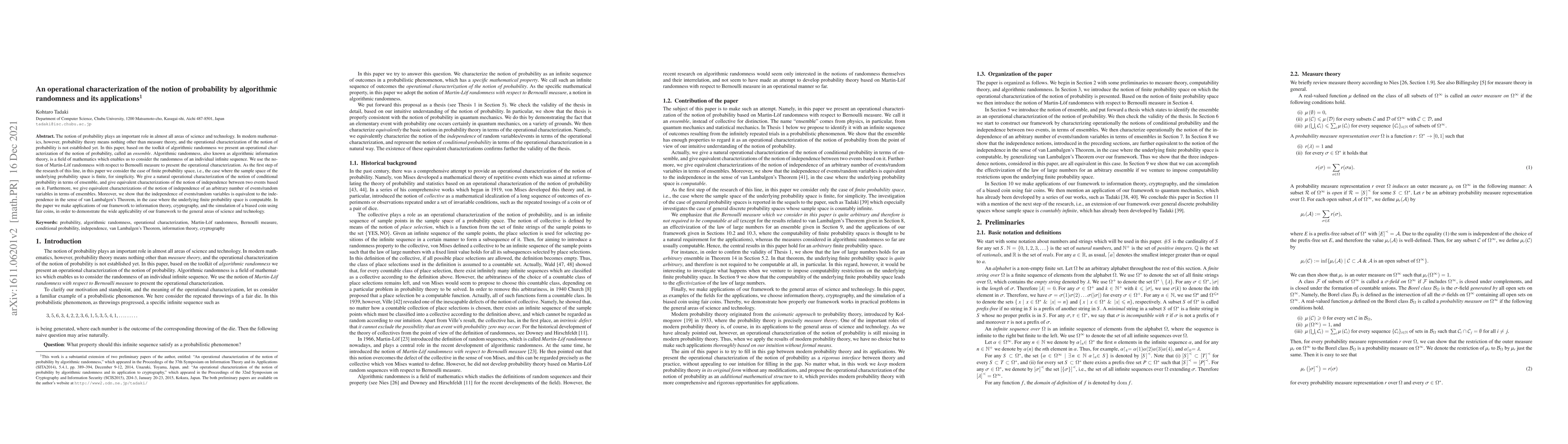 This paper presents an operational characterization of probability using algorithmic randomness, termed an ensemble, and applies it to finite probability spaces. It demonstrates the framework's utility in information theory, cryptography, and fair coin simulation.