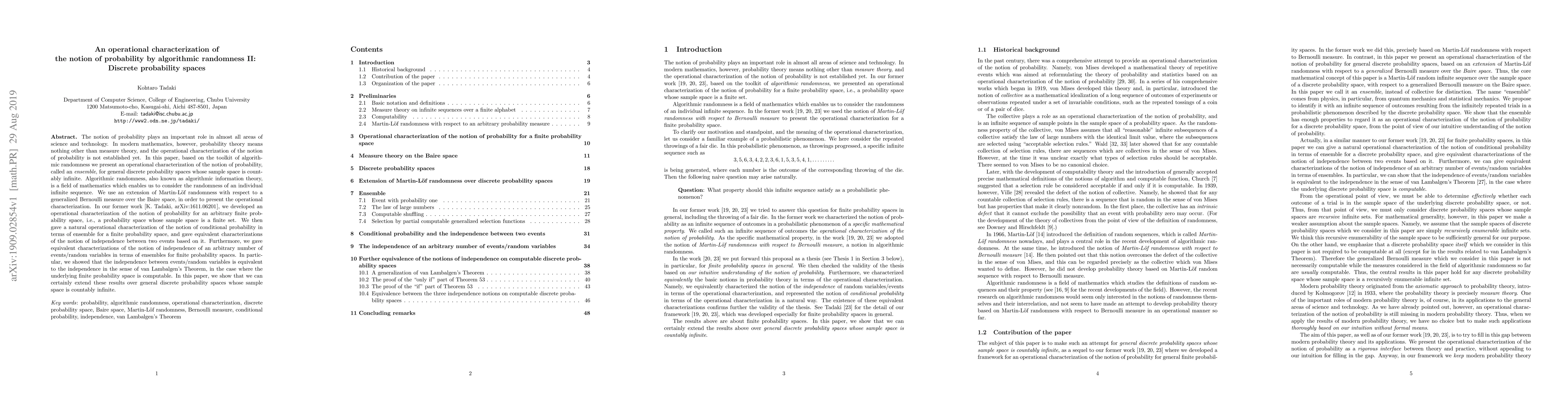 The paper presents an operational characterization of probability using algorithmic randomness, specifically focusing on discrete probability spaces with countably infinite sample spaces.