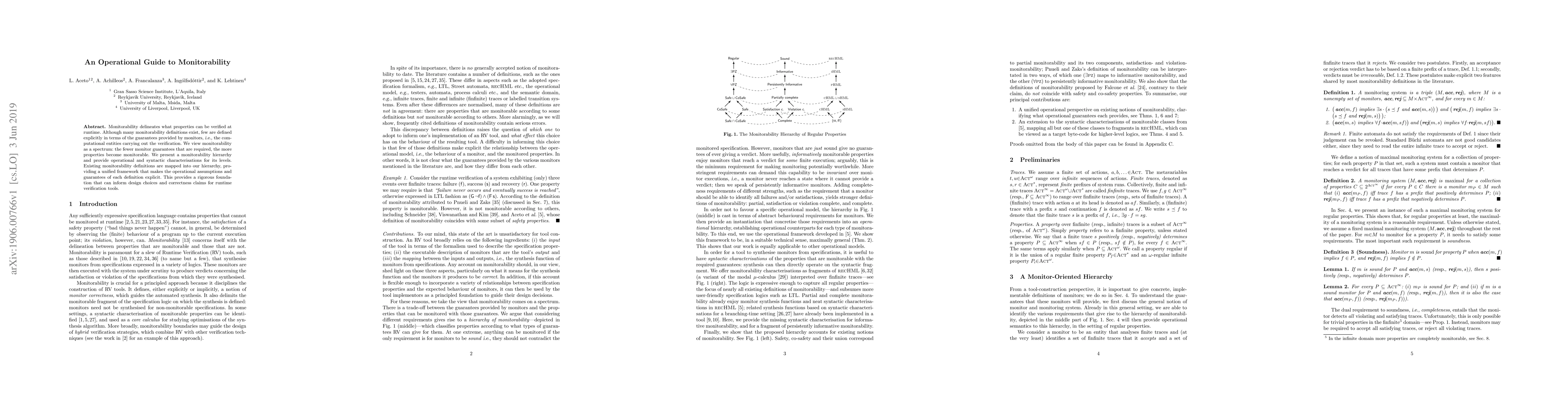 This paper introduces a monitorability hierarchy to clarify what properties can be verified at runtime, emphasizing the guarantees of monitors. It provides a unified framework that explicitly details the operational assumptions and guarantees of various monitorability definitions, aiding in the design and evaluation of runtime verification tools.