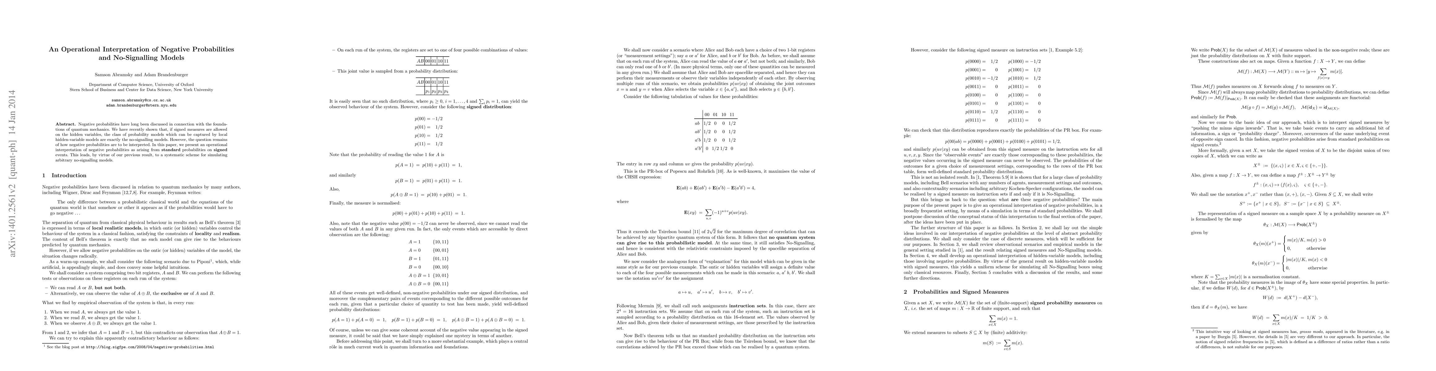 Negative probabilities have long been discussed in connection with the foundations of quantum mechanics. We have recently shown that, if signed measures are allowed on the hidden variables, the class of probability models which can be captured by local hidden-variable models are exactly the no-signalling models. However, the question remains of how negative probabilities are to be interpreted. In this paper, we present an operational interpretation of negative probabilities as arising from standard probabilities on signed events. This leads, by virtue of our previous result, to a systematic scheme for simulating arbitrary no-signalling models.