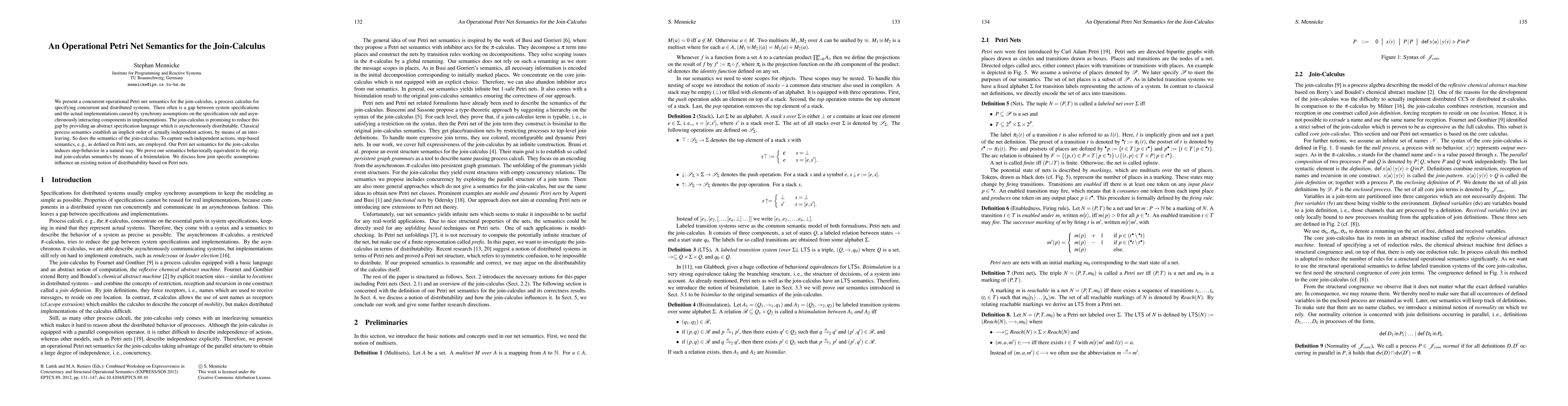This paper introduces a concurrent operational Petri net semantics for the join-calculus, aiming to bridge the gap between system specifications and asynchronous implementations. The proposed semantics captures independent actions naturally and proves behavioral equivalence to the original join-calculus semantics through bisimulation.