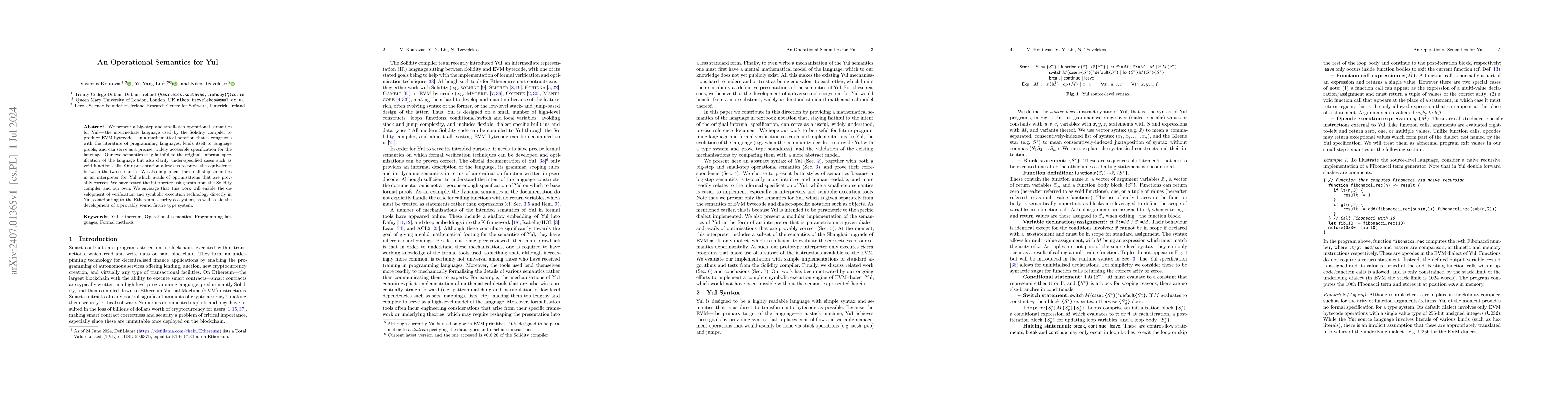 This paper introduces both big-step and small-step operational semantics for Yul, the intermediate language of Solidity, providing precise specifications and proofs of equivalence. An interpreter implementing the small-step semantics was developed and tested, aiming to enhance Ethereum security through verification and symbolic execution in Yul.