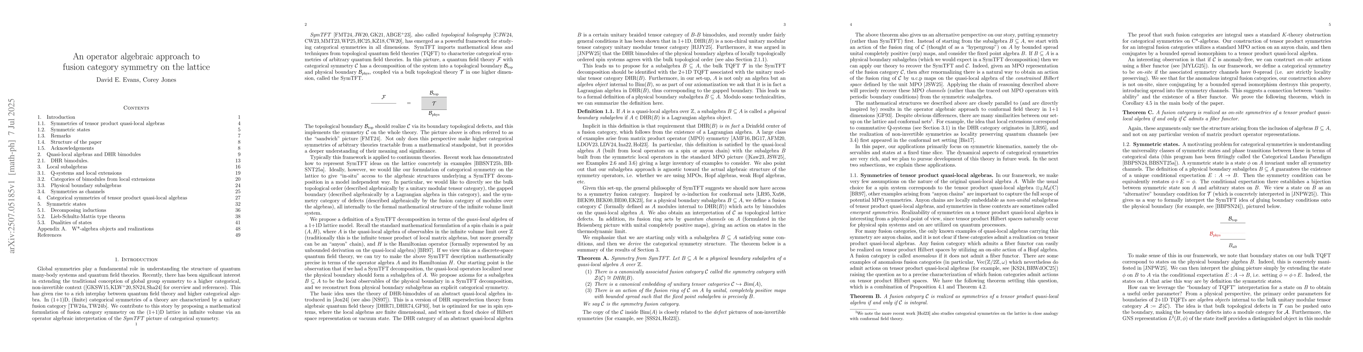 We propose a framework for fusion category symmetry on the (1+1)D lattice in the thermodynamic limit by giving a formal interpretation of SymTFT decompositions. Our approach is based on axiomatizing physical boundary subalgebra of quasi-local observables, and applying ideas from algebraic quantum field theory to derive the expected categorical structures. We show that given a physical boundary subalgebra $B$ of a quasi-local algebra $A$, there is a canonical fusion category $\mathcal{C}$ that acts on $A$ by bimodules and whose fusion ring acts by locality preserving quantum channels on the quasi-local algebra such that $B$ is recovered as the invariant operators. We show that a fusion category can be realized as symmetries of a tensor product spin chain if and only if all of its objects have integer dimensions, and that it admits an on-site action on a tensor product spin chain if and only if it admits a fiber functor. We give a formal definition of a topological symmetric state, and prove a Lieb-Schultz-Mattis type theorem. Using this, we show that for any fusion category $\mathcal{C}$ with no fiber functor there always exists gapless pure symmetric states on an anyon chain. Finally, we apply our framework to show that any state covariant under an anomalous Kramers-Wannier type duality must be gapless.