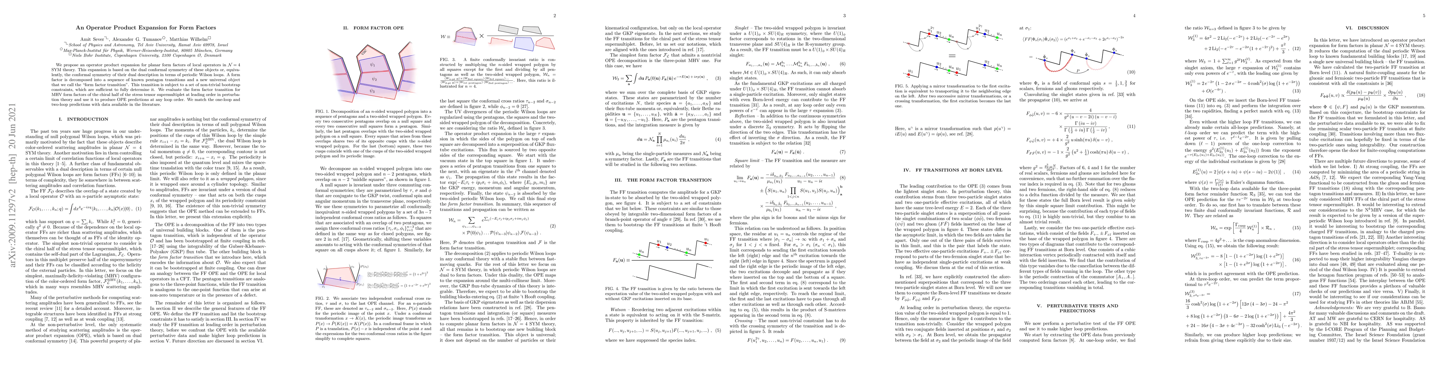 We propose an operator product expansion for planar form factors of local operators in $\mathcal{N}=4$ SYM theory. This expansion is based on the dual conformal symmetry of these objects or, equivalently, the conformal symmetry of their dual description in terms of periodic Wilson loops. A form factor is decomposed into a sequence of known pentagon transitions and a new universal object that we call the "form factor transition". This transition is subject to a set of non-trivial bootstrap constraints, which we expect to be sufficient to fully determine it. We evaluate the form factor transition for MHV form factors of the chiral half of the stress tensor supermultiplet at leading order in perturbation theory and use it to produce OPE predictions at any loop order. We match the one-loop and two-loop predictions with data available in the literature.