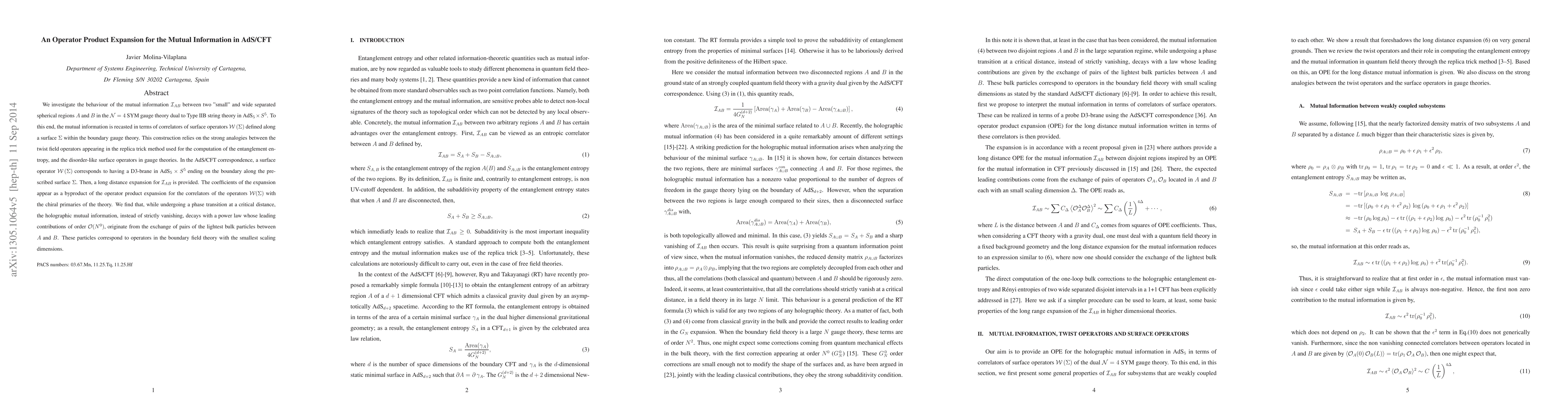 The mutual information between two separated regions in AdS/CFT theory decays with a power law after undergoing a phase transition, originating from the exchange of lightest bulk particles.