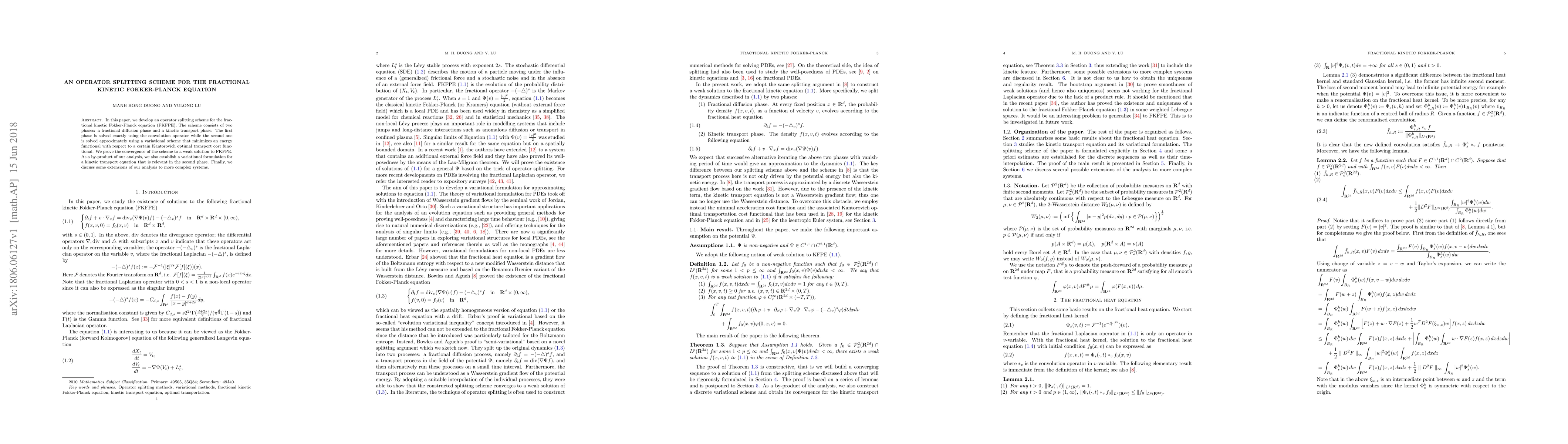 This paper introduces an operator splitting scheme for solving the fractional kinetic Fokker-Planck equation, combining exact fractional diffusion and approximate kinetic transport phases. The method is proven to converge to a weak solution and includes a variational formulation for the kinetic transport equation.