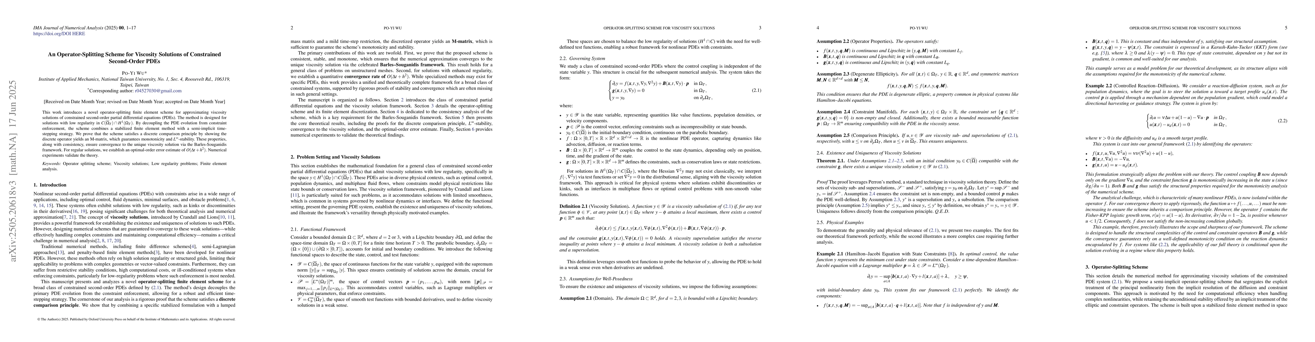 The main technical contribution is the development of an operator-splitting scheme ensuring consistency, stability, and monotonicity for constrained second-order PDEs with low-regularity solutions.