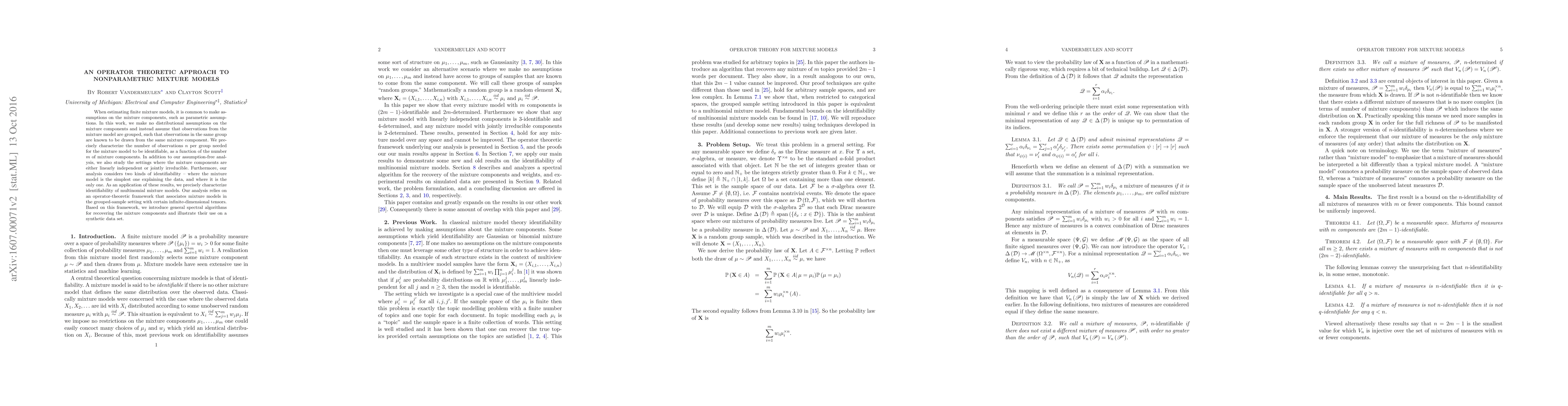 This paper proposes an operator-theoretic approach to nonparametric mixture models without distributional assumptions, focusing on the identifiability of mixture components based on grouped observations. It introduces spectral algorithms for recovering components and applies these methods to multinomial mixture models.