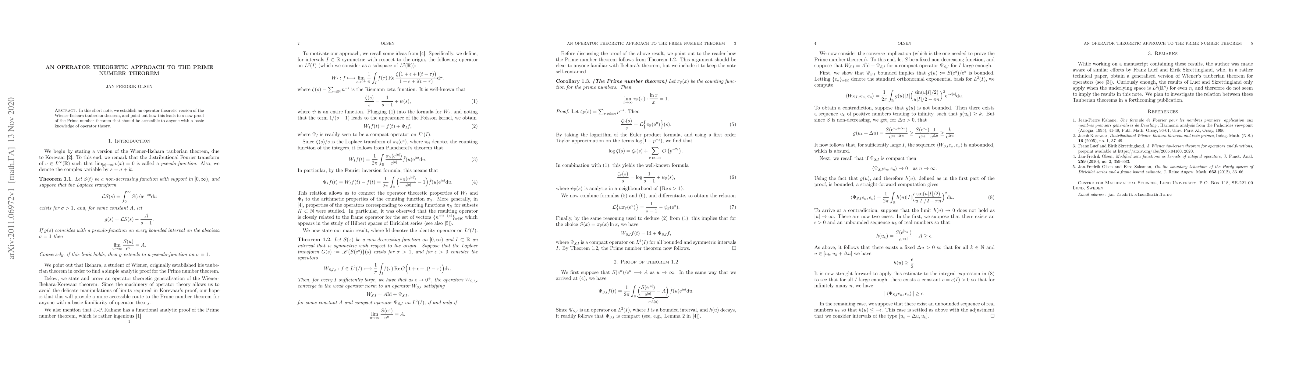 This paper establishes an operator theoretic version of the Wiener-Ikehara tauberian theorem, leading to a new proof of the Prime number theorem that can be understood by those with basic knowledge of operator theory.