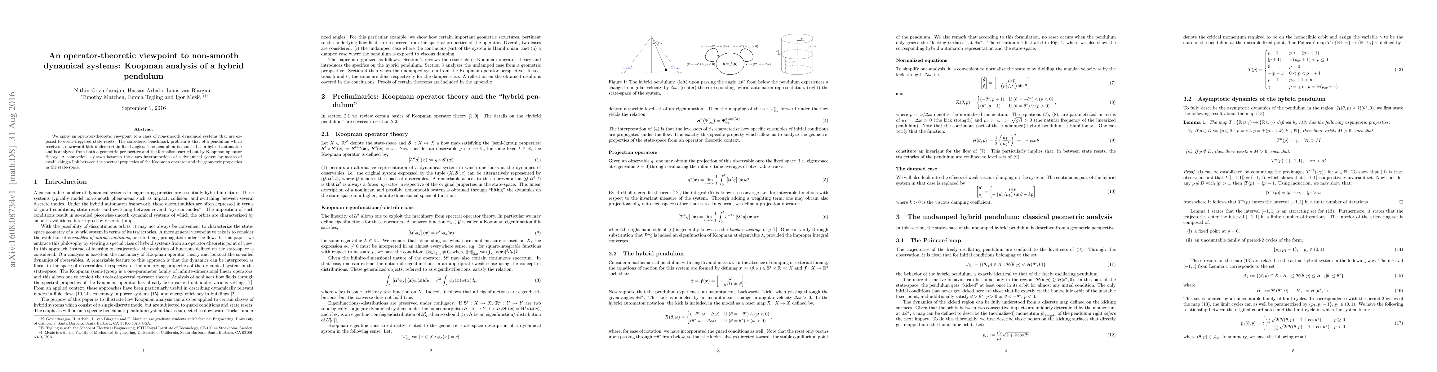 We apply an operator-theoretic viewpoint to a class of non-smooth dynamical systems that are exposed to event-triggered state resets. The considered benchmark problem is that of a pendulum which receives a downward kick under certain fixed angles. The pendulum is modeled as a hybrid automaton and is analyzed from both a geometric perspective and the formalism carried out by Koopman operator theory. A connection is drawn between these two interpretations of a dynamical system by means of establishing a link between the spectral properties of the Koopman operator and the geometric properties in the state-space.