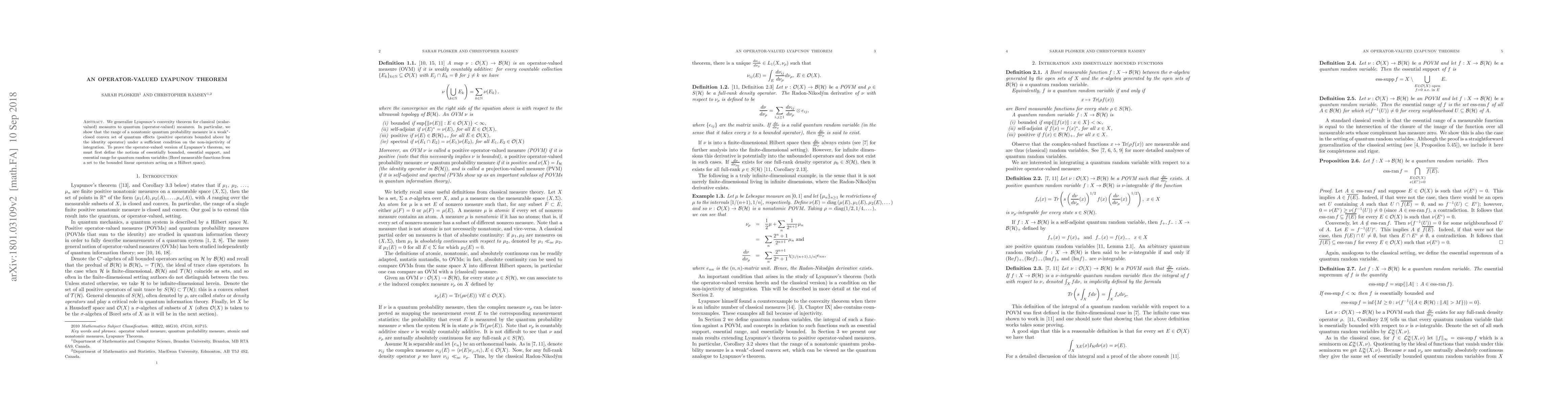 We generalize Lyapunov's convexity theorem for classical (scalar-valued) measures to quantum (operator-valued) measures. In particular, we show that the range of a nonatomic quantum probability measure is a weak*-closed convex set of quantum effects (positive operators bounded above by the identity operator) under a sufficient condition on the non-injectivity of integration. To prove the operator-valued version of Lyapunov's theorem, we must first define the notions of essentially bounded, essential support, and essential range for quantum random variables (Borel measurable functions from a set to the bounded linear operators acting on a Hilbert space).
