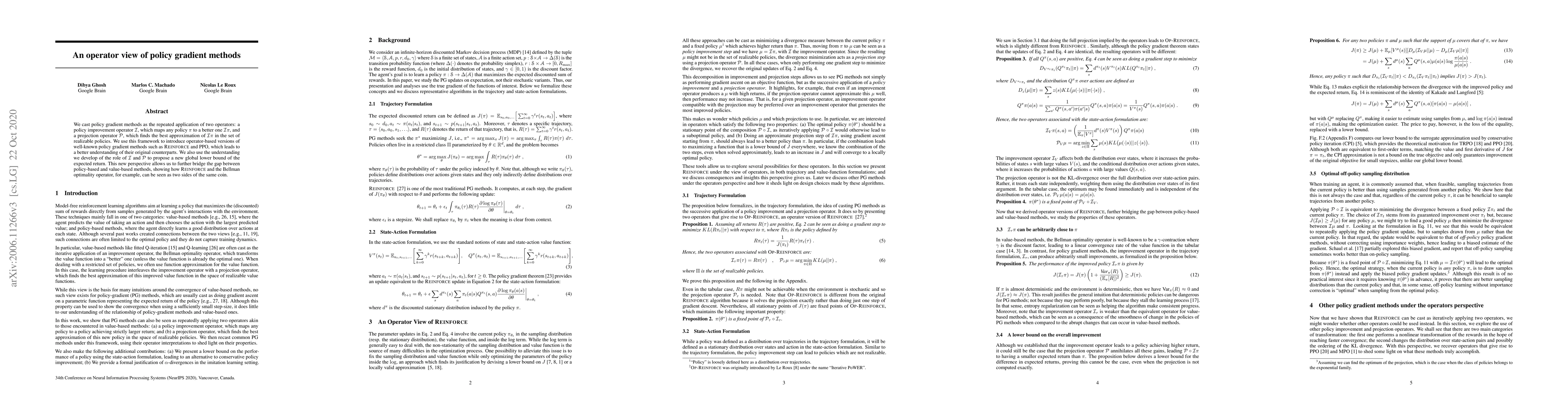We cast policy gradient methods as the repeated application of two operators: a policy improvement operator $\mathcal{I}$, which maps any policy $\pi$ to a better one $\mathcal{I}\pi$, and a projection operator $\mathcal{P}$, which finds the best approximation of $\mathcal{I}\pi$ in the set of realizable policies. We use this framework to introduce operator-based versions of traditional policy gradient methods such as REINFORCE and PPO, which leads to a better understanding of their original counterparts. We also use the understanding we develop of the role of $\mathcal{I}$ and $\mathcal{P}$ to propose a new global lower bound of the expected return. This new perspective allows us to further bridge the gap between policy-based and value-based methods, showing how REINFORCE and the Bellman optimality operator, for example, can be seen as two sides of the same coin.