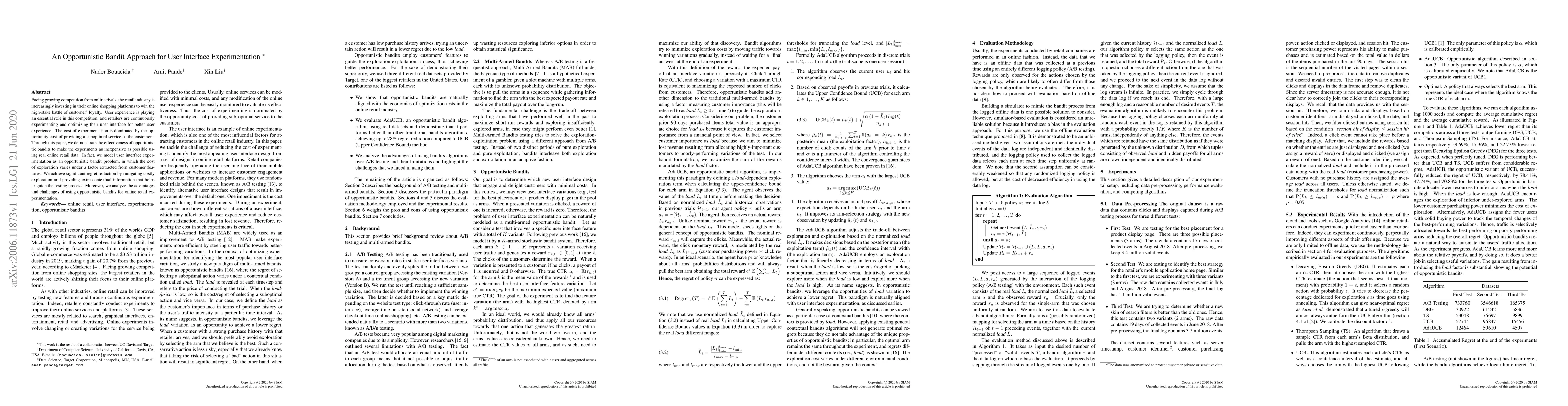 This paper explores the use of opportunistic bandit algorithms to optimize user interface experimentation in online retail, minimizing costs while enhancing user experience. The approach effectively reduces regret by strategically balancing exploration and exploitation, leveraging customer data to guide testing.