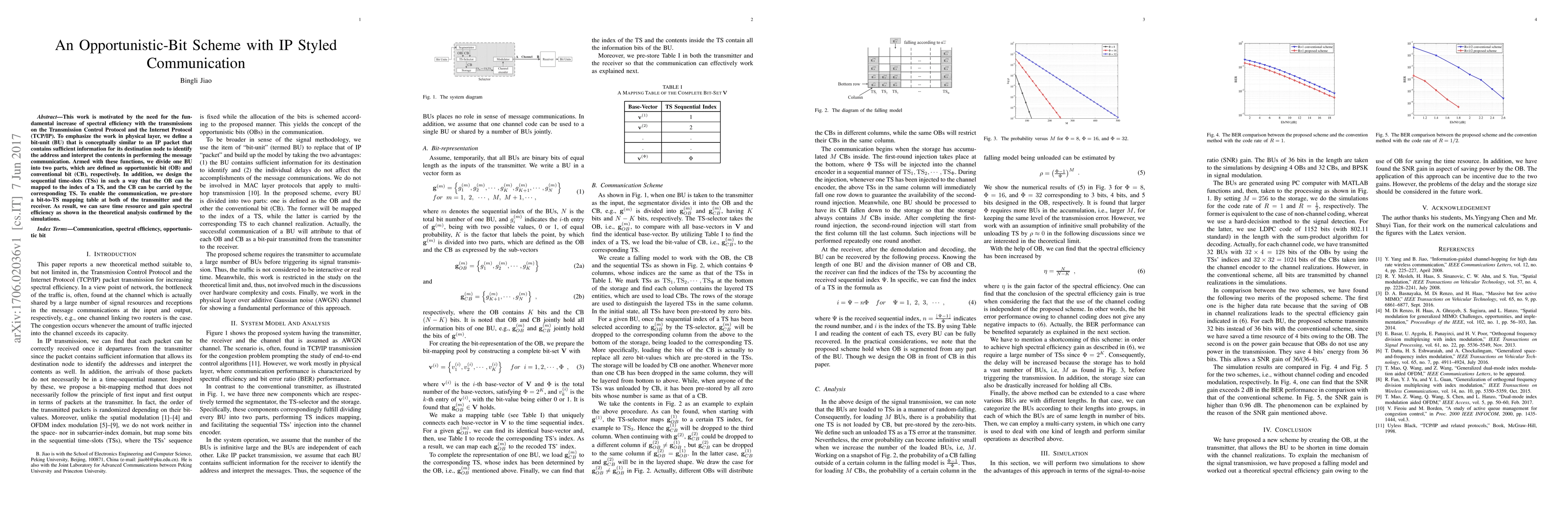 This work is motivated by the need for the fundamental increase of spectral efficiency with the transmissions on the Transmission Control Protocol and the Internet Protocol (TCP/IP). To emphasize the work in physical layer, we define a bit-unit (BU) that is conceptually similar to an IP packet that contains sufficient information for its destination node to identify the address and interpret the contents in performing the message communication. Armed with these functions, we divide one BU into two parts, which are defined as opportunistic bit (OB) and conventional bit (CB), respectively. In addition, we design the sequential time-slots (TSs) in such a way that the OB can be mapped to the index of a TS, and the CB can be carried by the corresponding TS. To enable the communication, we pre-store a bit-to-TS mapping table at both of the transmitter and the receiver. As result, we can save time resource and gain spectral efficiency as shown in the theoretical analysis confirmed by the simulations.