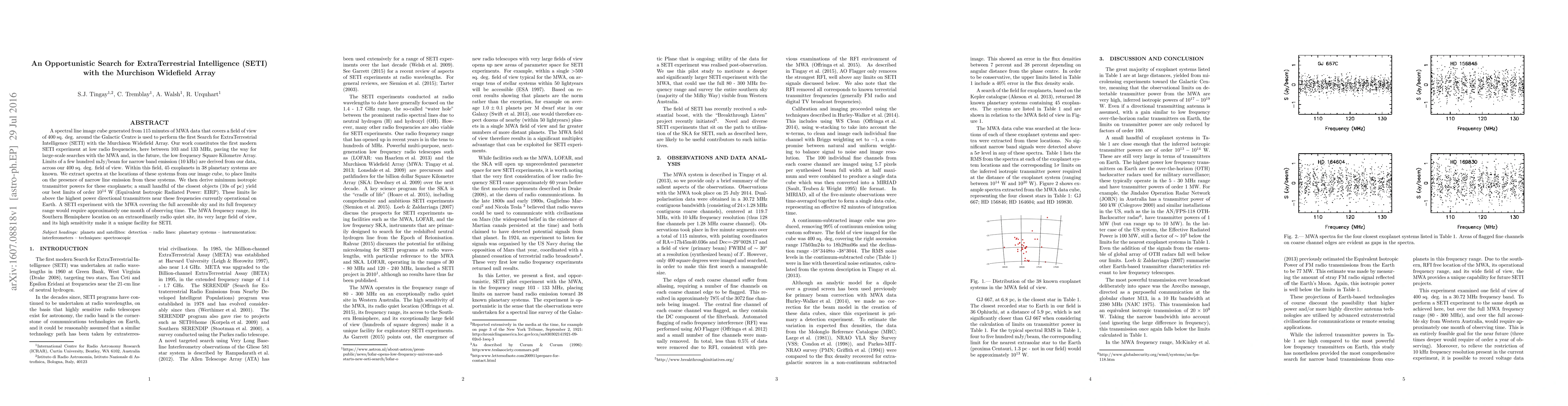 This paper reports the first modern SETI experiment using the Murchison Widefield Array (MWA) at low radio frequencies, deriving limits on narrow band emission and minimum transmitter powers for exoplanets. The MWA's large field of view and sensitivity make it a unique tool for future large-scale SETI searches.