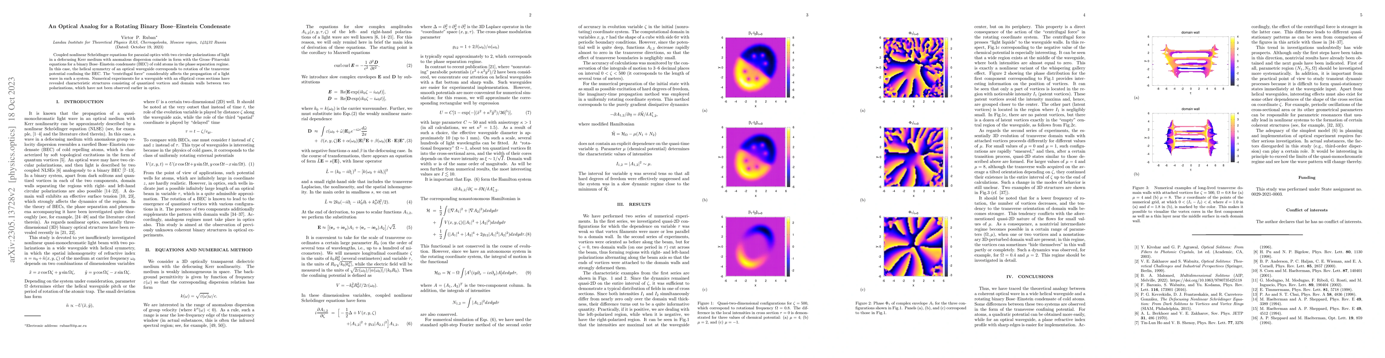 This paper establishes an analogy between optical waveguides and rotating binary Bose-Einstein condensates, showing that light wave propagation in a defocusing Kerr medium mirrors the dynamics of a binary BEC. Numerical simulations reveal novel optical structures, including quantized vortices and domain walls, in elliptical waveguides.