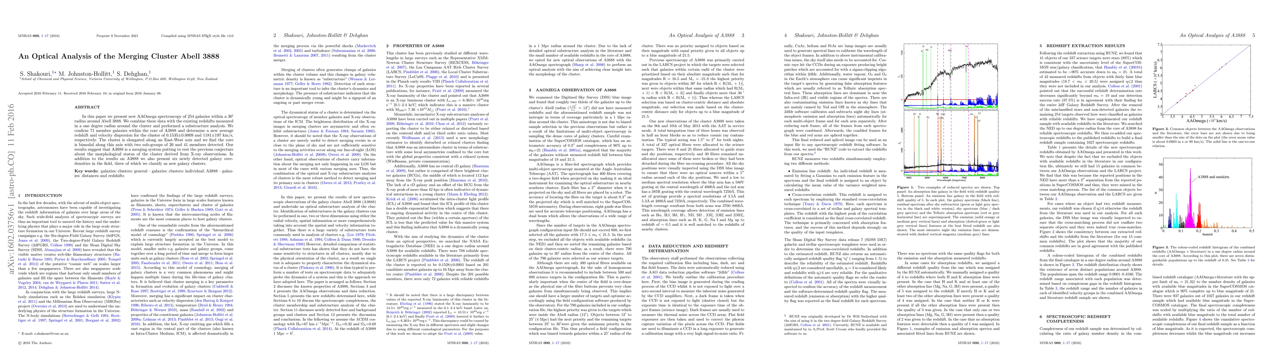 In this paper we present new AAOmega spectroscopy of 254 galaxies within a 30' radius around Abell 3888. We combine these data with the existing redshifts measured in a one degree radius around the cluster and performed a substructure analysis. We confirm 71 member galaxies within the core of A3888 and determine a new average redshift and velocity dispersion for the cluster of 0.1535 +\- 0.0009 and 1181 +\- 197 km/s, respectively. The cluster is elongated along an East-West axis and we find the core is bimodal along this axis with two sub-groups of 26 and 41 members detected. Our results suggest that A3888 is a merging system putting to rest the previous conjecture about the morphological status of the cluster derived from X-ray observations. In addition to the results on A3888 we also present six newly detected galaxy over-densities in the field, three of which we classify as new galaxy clusters.