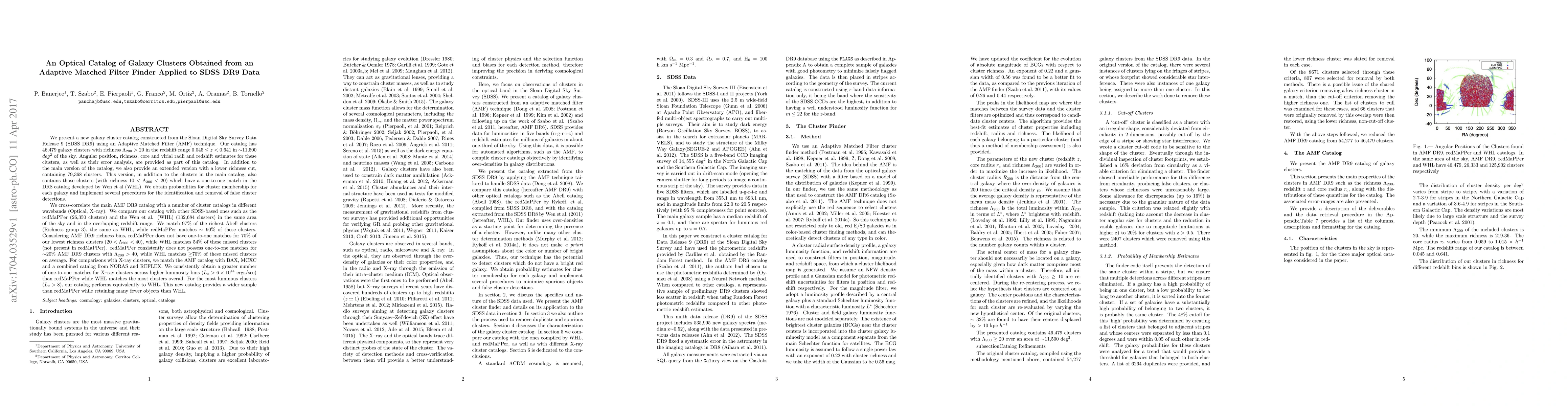 This paper presents a new galaxy cluster catalog derived from SDSS DR9 using an Adaptive Matched Filter technique, containing 46,479 clusters with high richness and redshift range. The catalog is compared with other SDSS-based and X-ray cluster catalogs, showing superior matches for the most luminous clusters and providing a wider sample than redMaPPer.