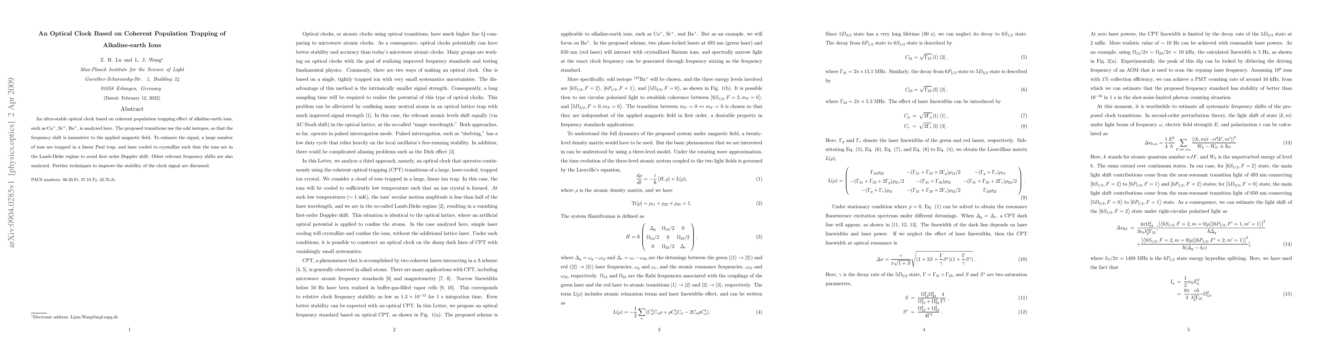 An optical clock based on coherent population trapping of alkaline-earth ions is proposed for enhanced stability, using Ca$^+$, Sr$^+$, and Ba$^+$ isotopes to minimize magnetic field effects.