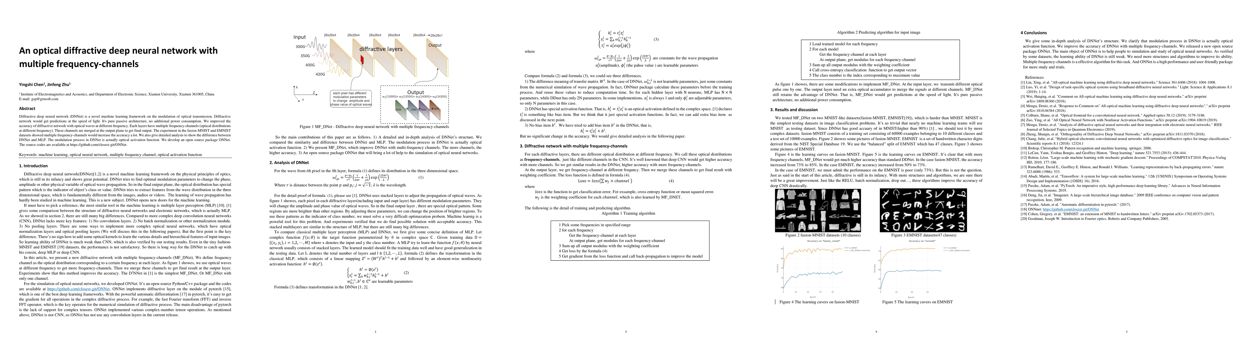 Diffractive deep neural network (DNNet) is a novel machine learning framework on the modulation of optical transmission. Diffractive network would get predictions at the speed of light. It's pure passive architecture, no additional power consumption. We improved the accuracy of diffractive network with optical waves at different frequency. Each layers have multiple frequency-channels (optical distributions at different frequency). These channels are merged at the output plane to get final output. The experiment in the fasion-MNIST and EMNIST datasets showed multiple frequency-channels would increase the accuracy a lot. We also give detailed analysis to show the difference between DNNet and MLP. The modulation process in DNNet is actually optical activation function. We develop an open source package ONNet. The source codes are available at https://github.com/closest-git/ONNet.