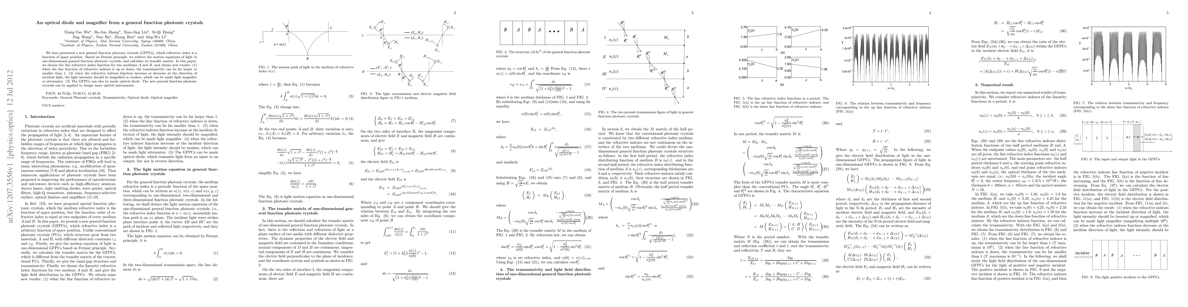 This paper introduces general function photonic crystals (GFPCs) where the refractive index varies spatially. Using the Fermat principle, it derives light motion equations and a transfer matrix, demonstrating that GFPCs can function as optical diodes and magnifiers based on the spatial variation of refractive indices.