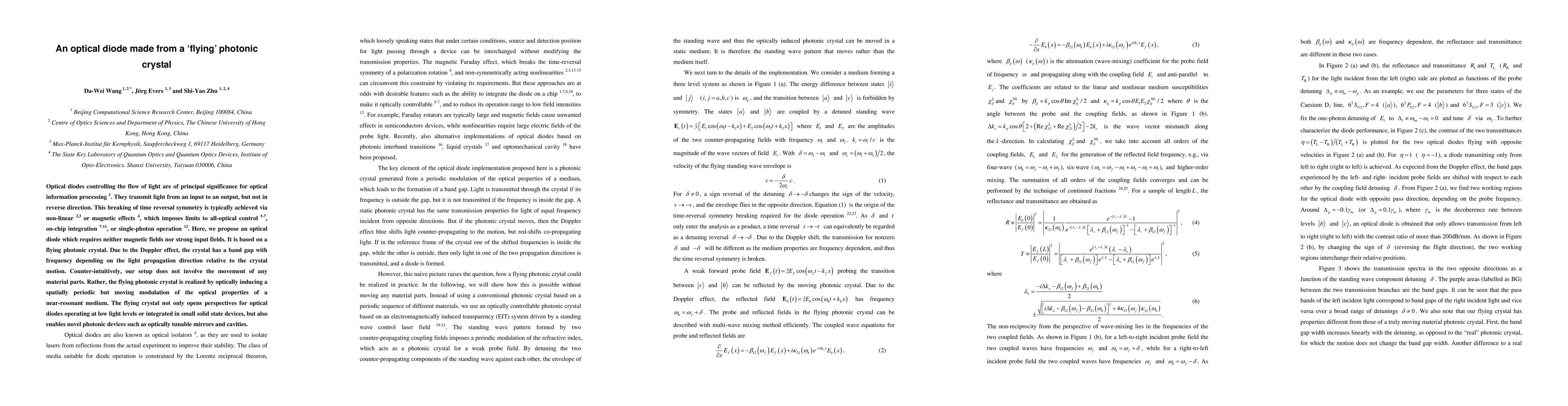 This research proposes an optical diode based on a flying photonic crystal that operates without magnetic fields or strong input fields. Utilizing the Doppler effect, the diode achieves unidirectional light transmission through a dynamically modulated medium, offering potential for low-light operation and integration into compact devices.