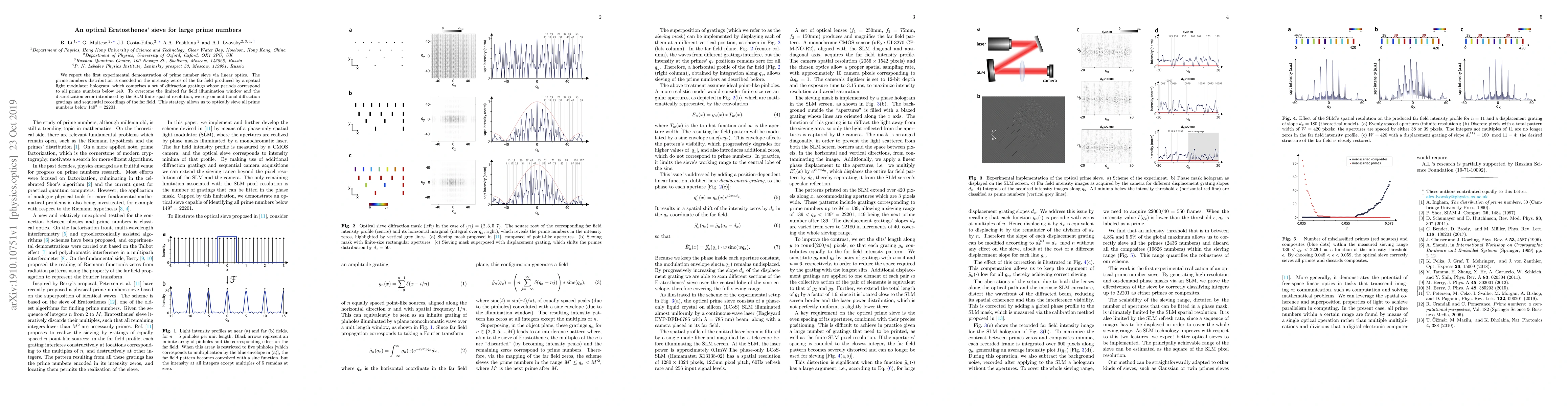 This paper presents an optical method for identifying prime numbers using linear optics and a spatial light modulator hologram with diffraction gratings. The technique successfully sieves all prime numbers below 22,201 by encoding their distribution in the intensity zeros of the far field.