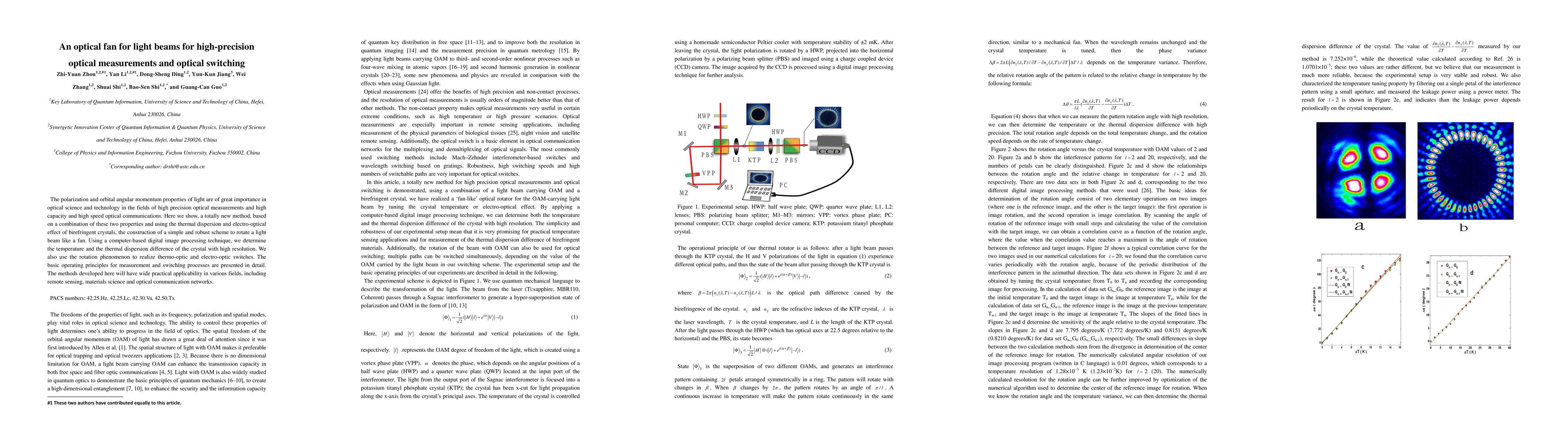 This paper introduces a novel optical fan method for rotating light beams using polarization and orbital angular momentum properties, leveraging thermal dispersion and electro-optical effects in birefringent crystals. The technique enables high-precision optical measurements and optical switching, with potential applications in remote sensing, materials science, and optical communication networks.