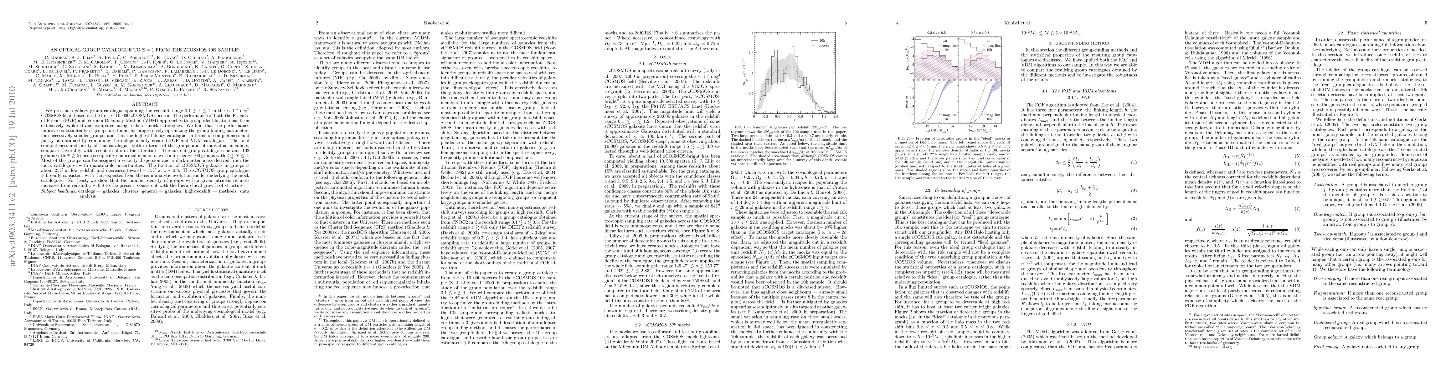 This paper presents a galaxy group catalogue up to z=1 derived from the zCOSMOS 10k sample, employing both FOF and VDM methods for optimal group identification. The combined catalogue shows high completeness and purity, containing 102 groups with at least 5 members and ~700 smaller groups, consistent with semi-analytic models and indicating an increasing group number density over time.