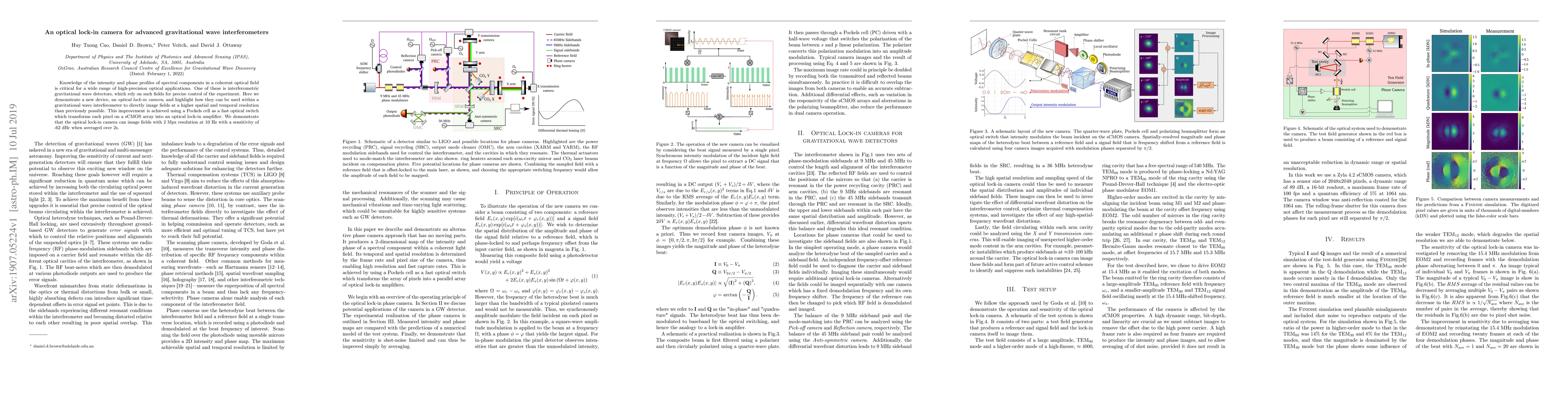 Knowledge of the intensity and phase profiles of spectral components in a coherent optical field is critical for a wide range of high-precision optical applications. One of these is interferometric gravitational wave detectors, which rely on such fields for precise control of the experiment. Here we demonstrate a new device, an \textit{optical lock-in camera}, and highlight how they can be used within a gravitational wave interferometer to directly image fields at a higher spatial and temporal resolution than previously possible. This improvement is achieved using a Pockels cell as a fast optical switch which transforms each pixel on a sCMOS array into an optical lock-in amplifier. We demonstrate that the optical lock-in camera can image fields with 2~Mpx resolution at 10~Hz with a sensitivity of -62~dBc when averaged over 2s.