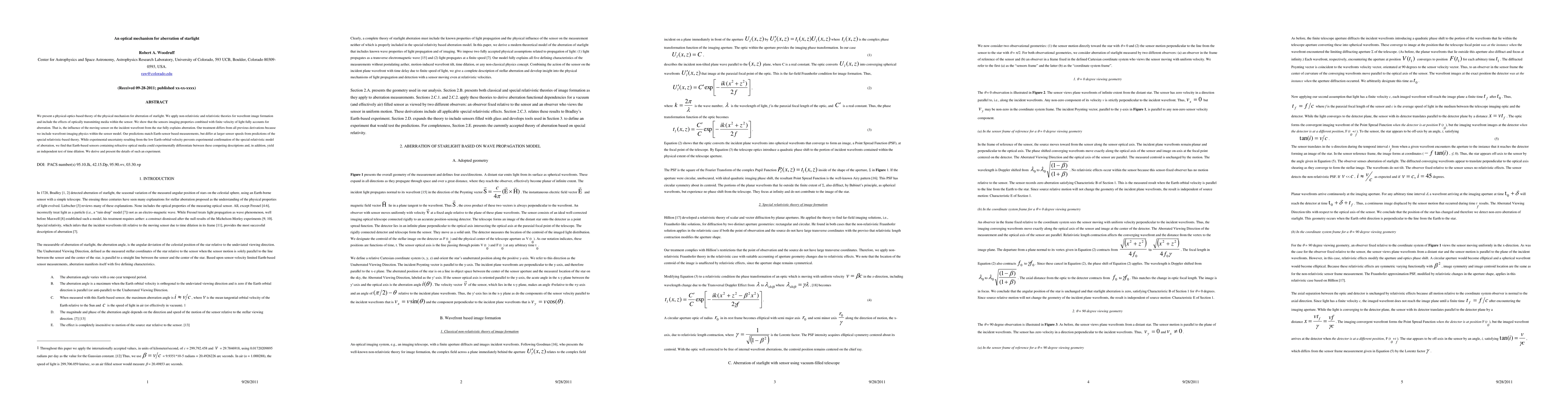 This research develops a physics-based explanation for why starlight appears shifted (aberration) due to the movement of sensors, incorporating wavefront imaging and media effects. It suggests that experiments with Earth-based optical sensors could test different theories, including special relativity, and even examine time dilation effects.