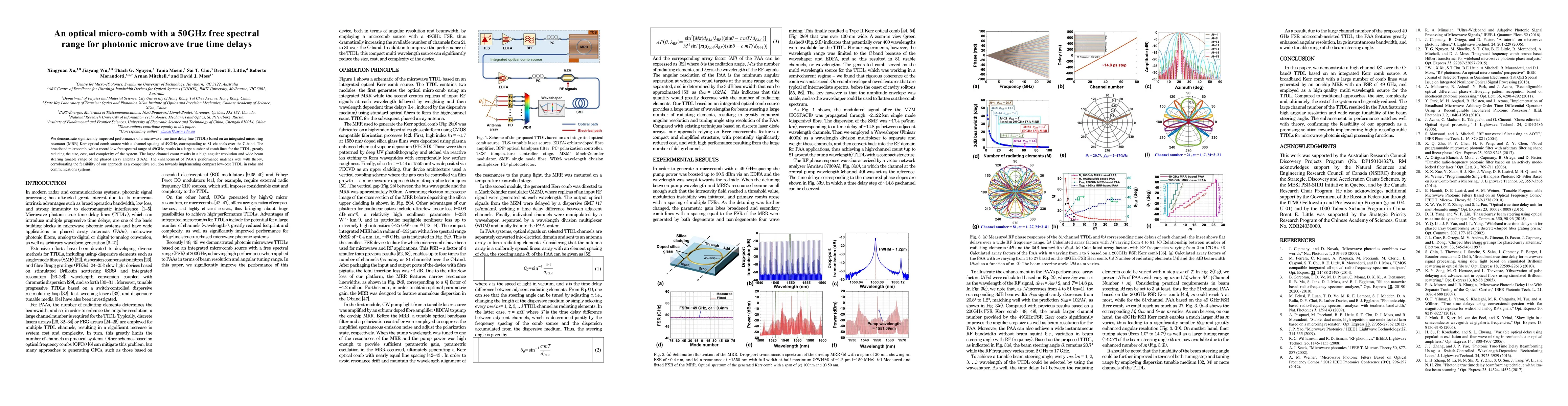 This research demonstrates an enhanced microwave true time delay line using an integrated micro-ring resonator Kerr optical micro-comb with 49GHz channel spacing, significantly reducing system size, cost, and complexity while improving phased array antenna performance. The large number of comb lines achieves high angular resolution and wide beam steering, validating the approach for compact, low-cost applications in radar and communications.