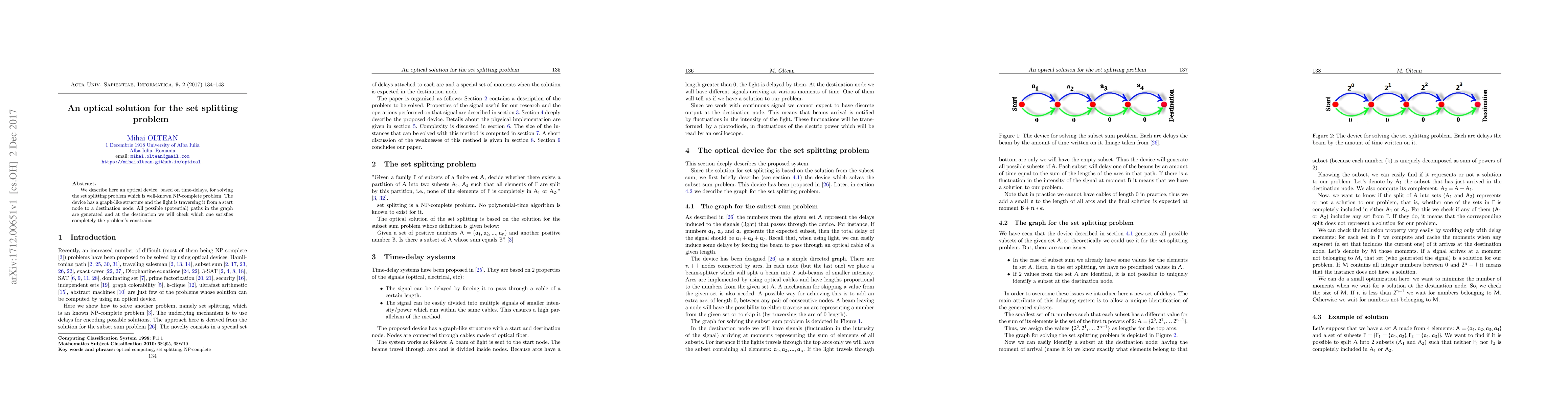 We describe here an optical device, based on time-delays, for solving the set splitting problem which is well-known NP-complete problem. The device has a graph-like structure and the light is traversing it from a start node to a destination node. All possible (potential) paths in the graph are generated and at the destination we will check which one satisfies completely the problem's constrains.